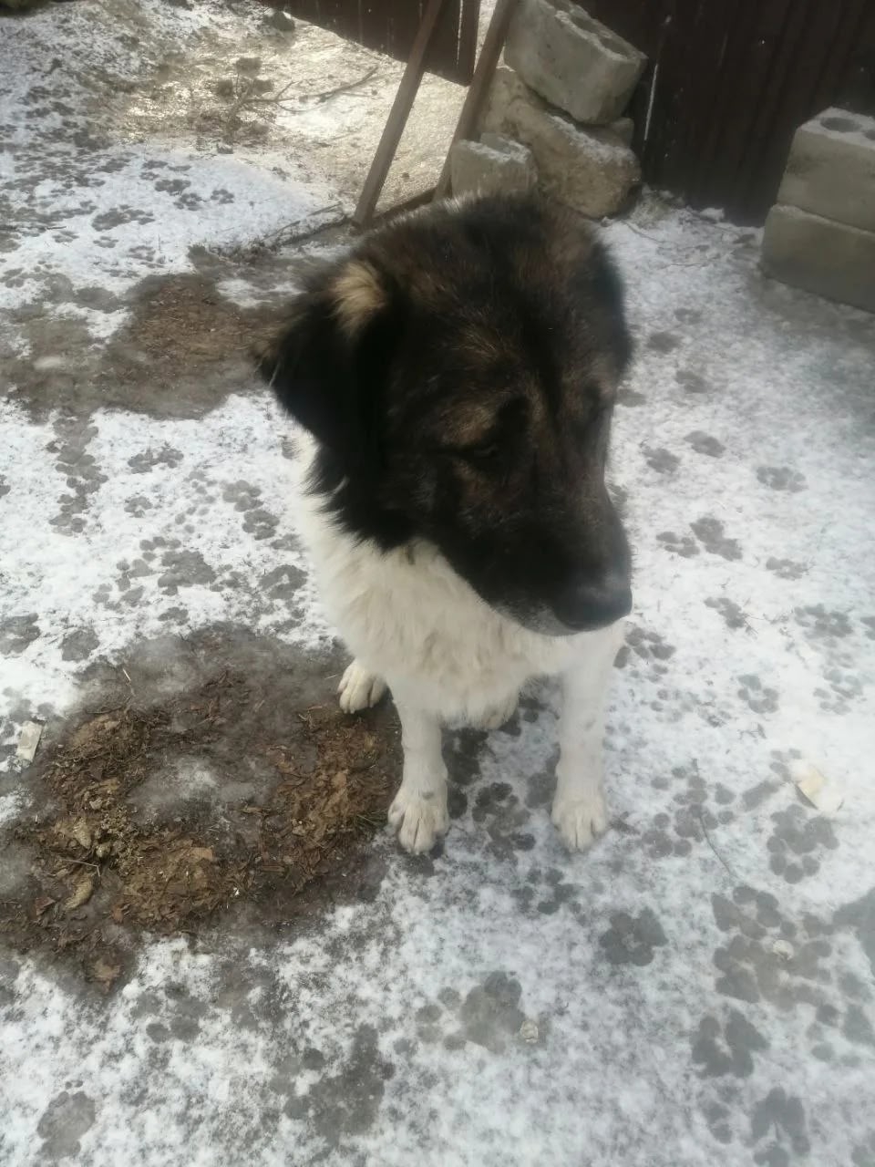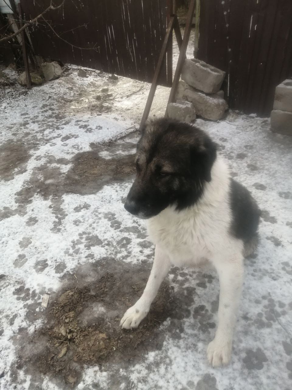 На заброшенном участке, там стройка заброшенная, выживаниет собака, среднеазиатская овчарка.