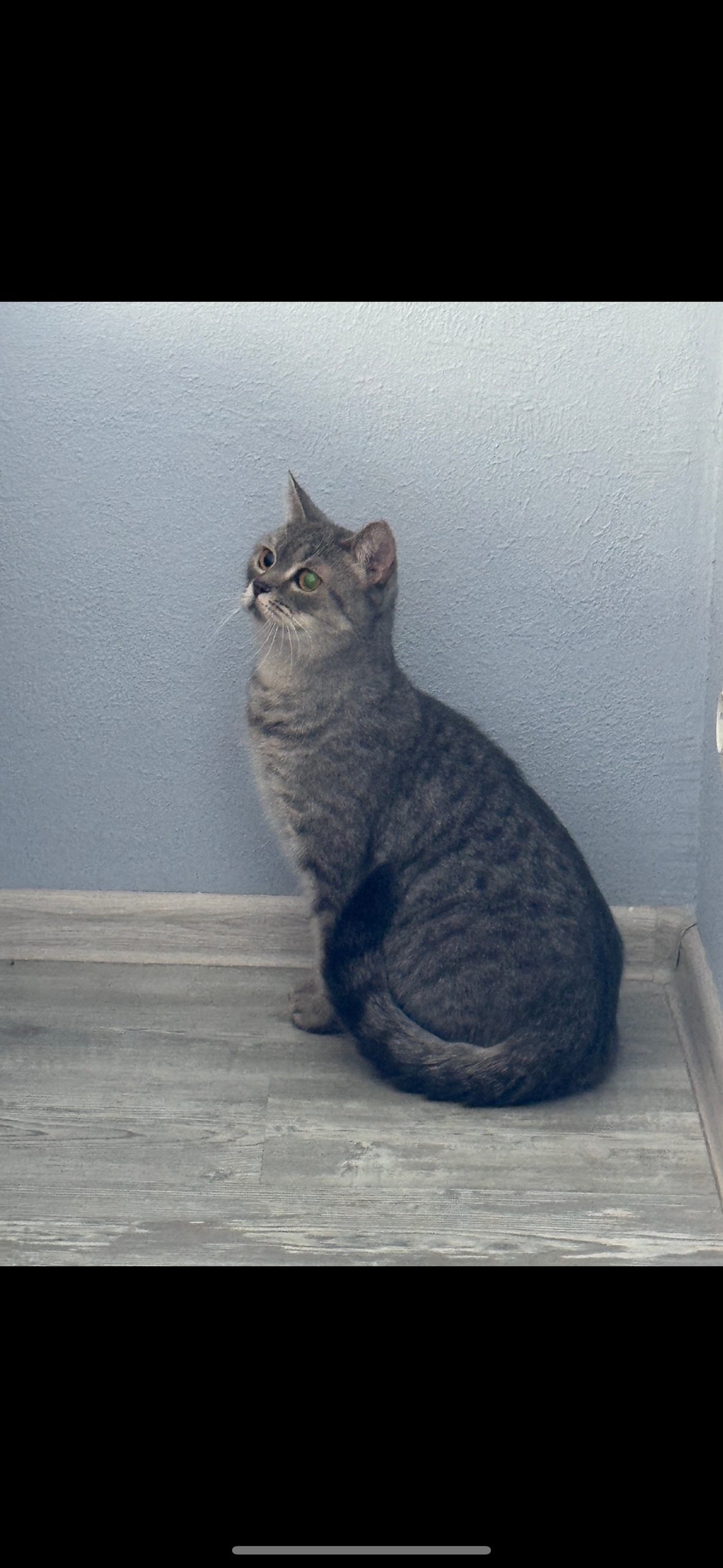 Серая, домашняя, с яркими оранжевыми глазами. Очень дружелюбная, но может пугаться незнакомцев.
