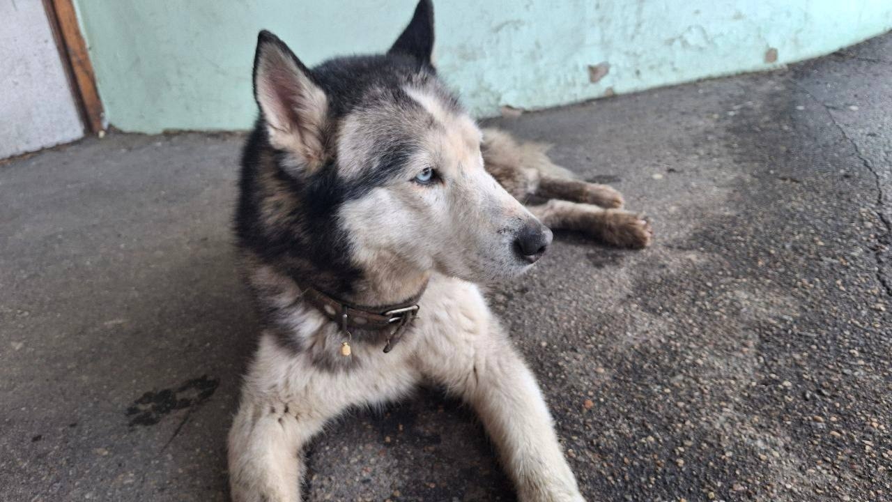 Глаза голубые ,окрас черно белый, ошейник с заклепками. Висит адресник , но нижняя часть адресника с телефоном сломана и потеряна.