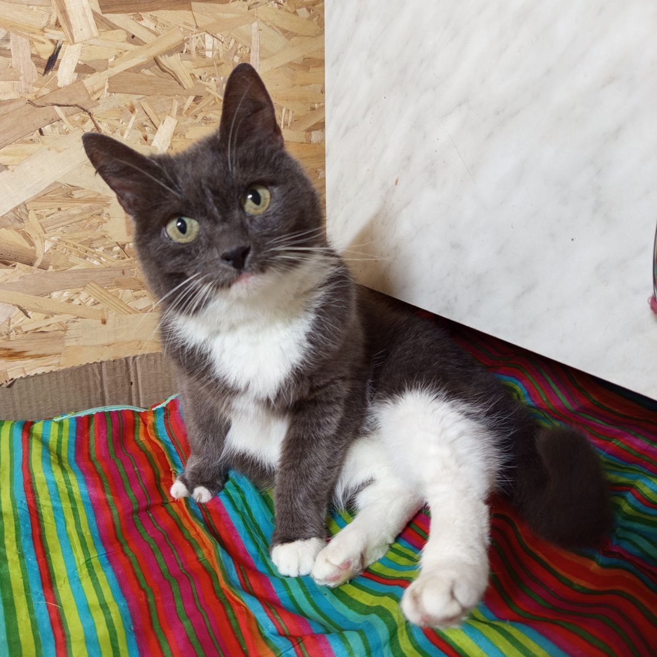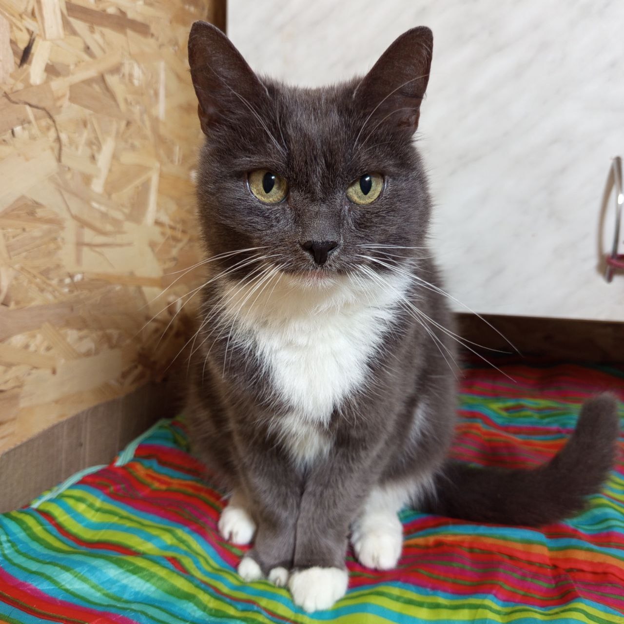 Ее нашли летом 2024 г. в брагинских дворах. У нее была травма передней лапки, вместо пальчиков торчали голые косточки. На лапке провели операцию, и теперь о былой беде ничего не напоминает, кошечка предвигатеся как обычно, остался только внешний изьян. Но разве это помеха для любящего сердца?