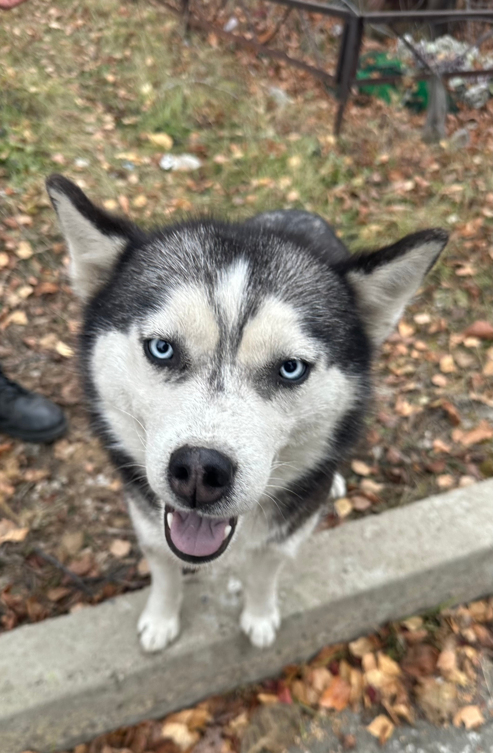 Без ошейника, видно, что домашняя — дружелюбная, подходит к людям, глаза ярко-голубые 🐺💙