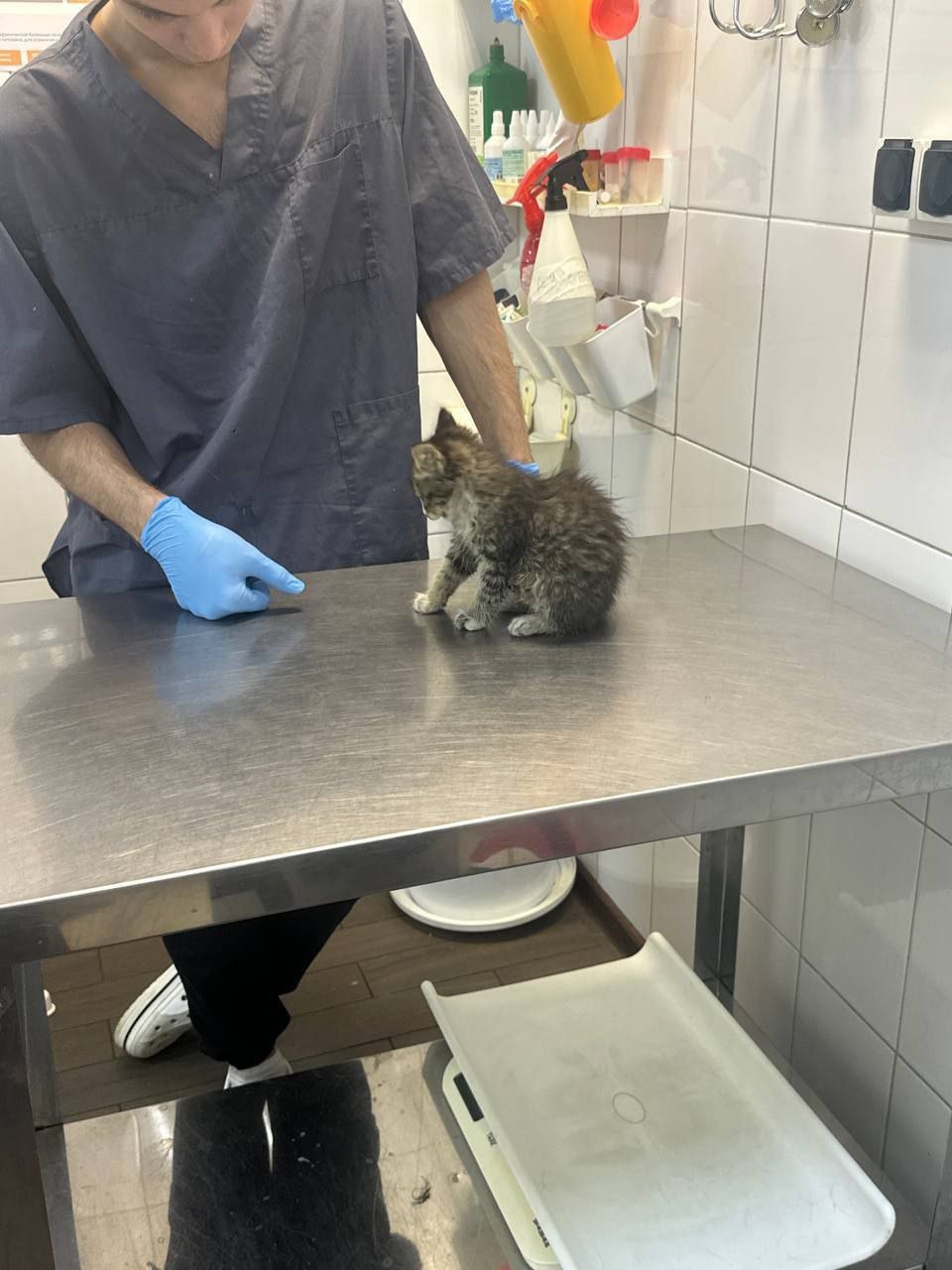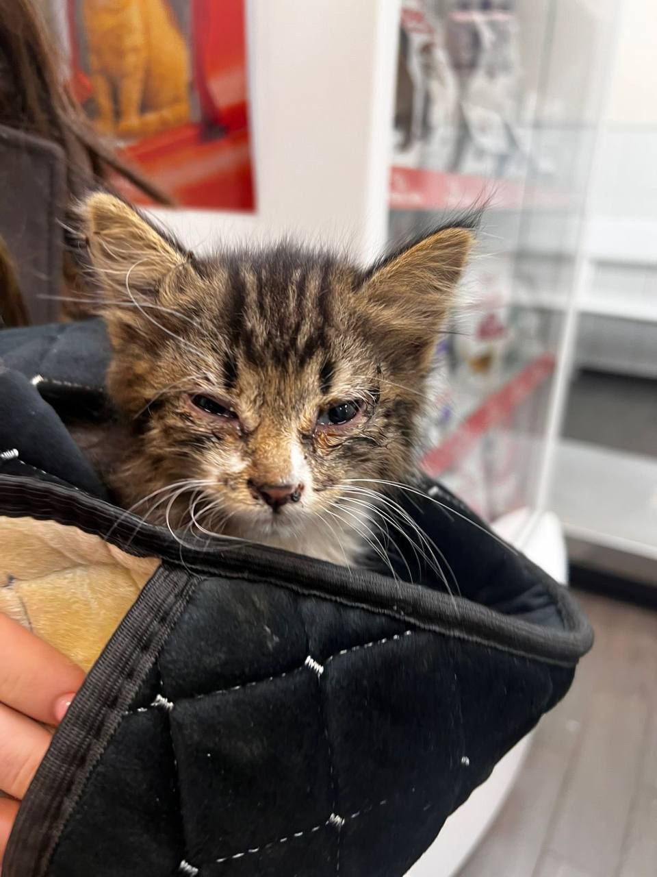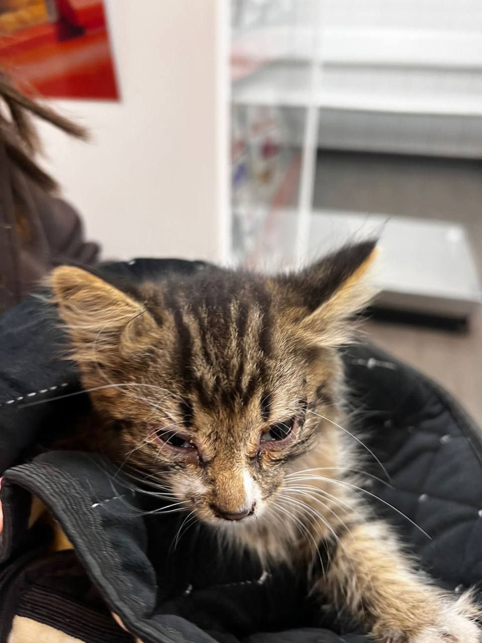 Найден кот или кошка в районе деревня островцы , маленький от силы может месяца 3-4 отвезли в ветеринарную клинику провели осмотр и сделали всё возможное , но к сожалению не куда приютить его а на улице оставить жалко