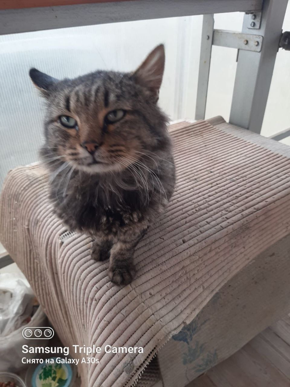 Прибился к соседям котик, возраст около года. Ласковый добрый. Мы его откармливаем. Оставить не можем.