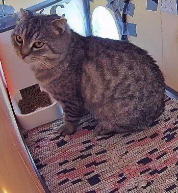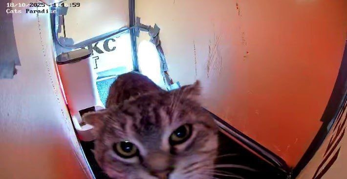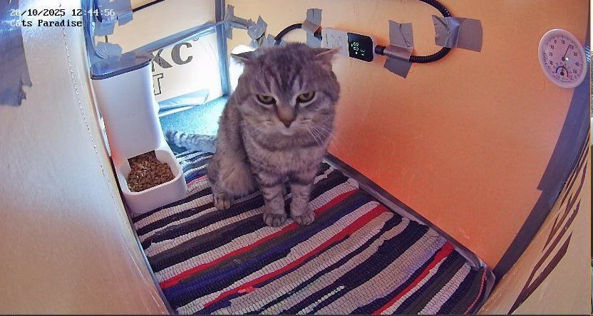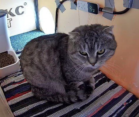 Кот, примерно 2-3 года (может быть, старше), небольшой, пугливый, но бывшедомашний. Первые дни ходил по улице и орал, потом поселился в “домике”, продолжает бояться, поэтому фото только с камеры.