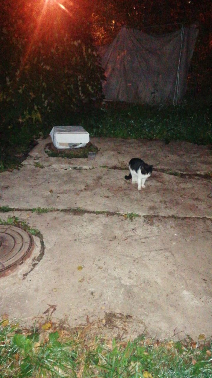 Женщина сделала ему домик, он в нём и живёт, так как продухи во всём дворе закрыты.