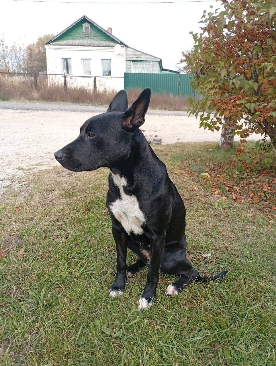 Метис около 1-1,5 лет, окрас черный с белой грудкой, гладкошерстная, была без амуниции и адресника