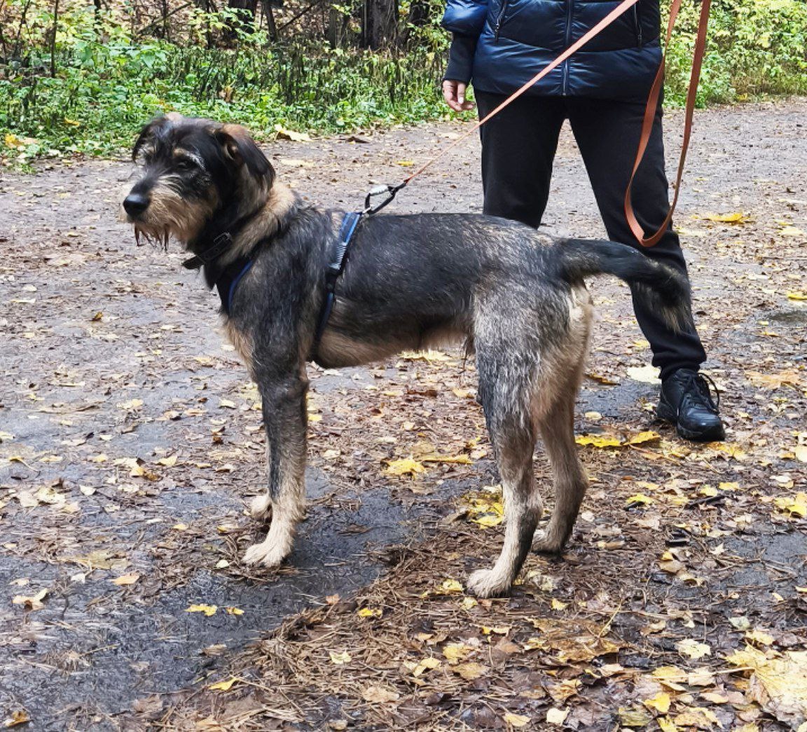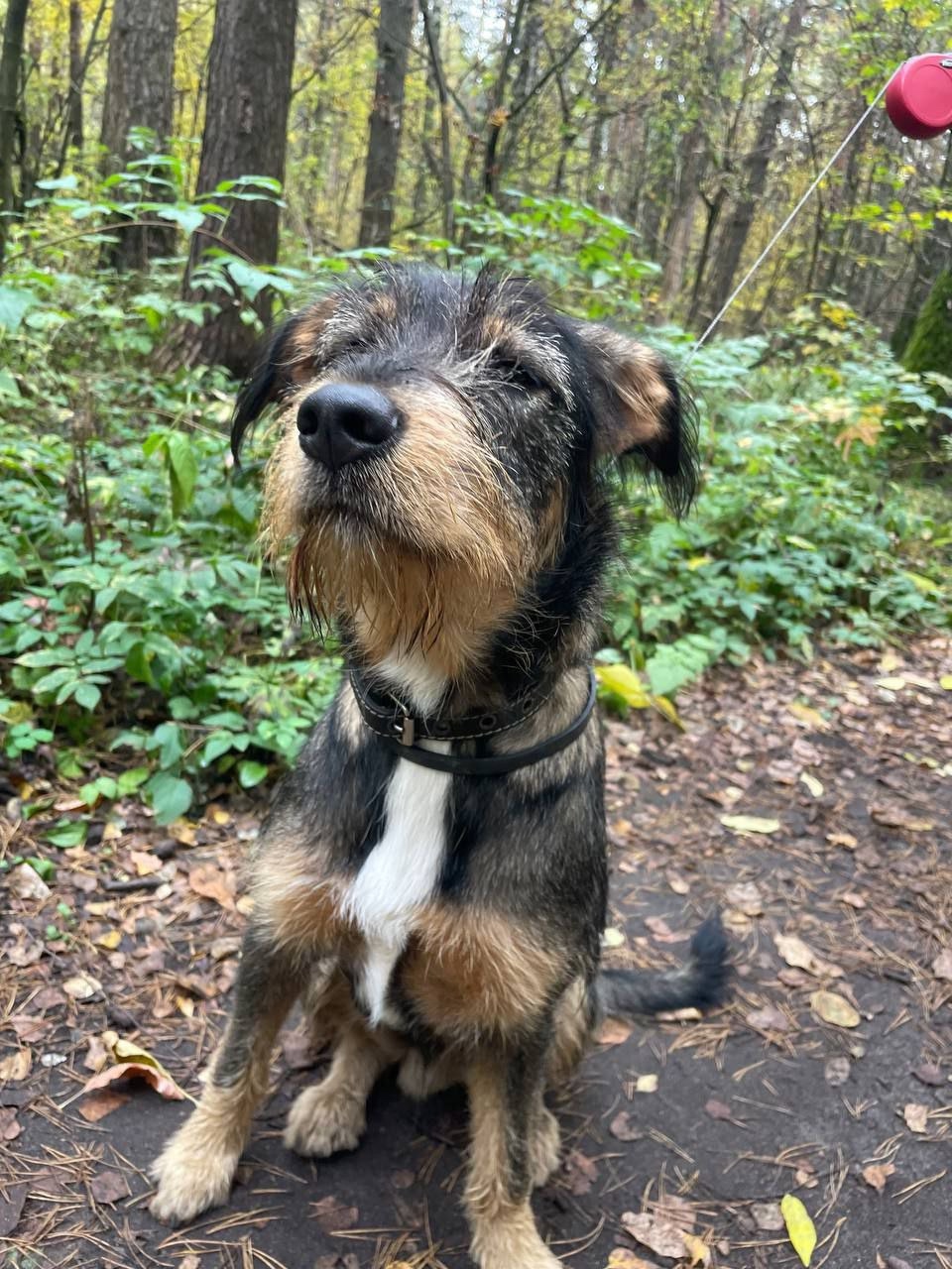 Молодой кобель, метис “бородатик”, не кастрирован, вес около 20кг. Темно коричневый верх, низ светлее с рыжиной, на груди белая полоска.