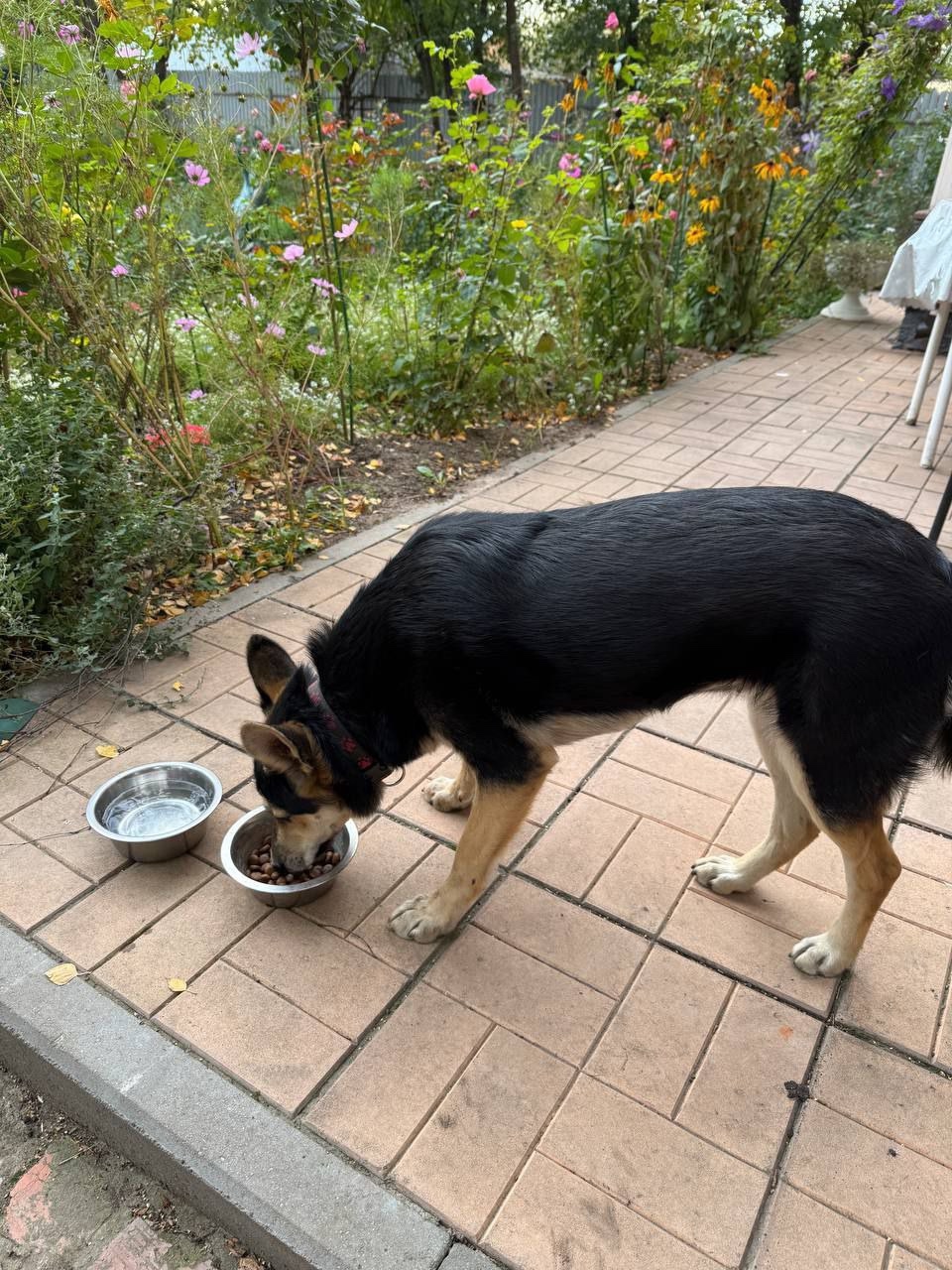девочка, темный окрас, молодая, с ошейником с красными собачими лапами, ухожена
