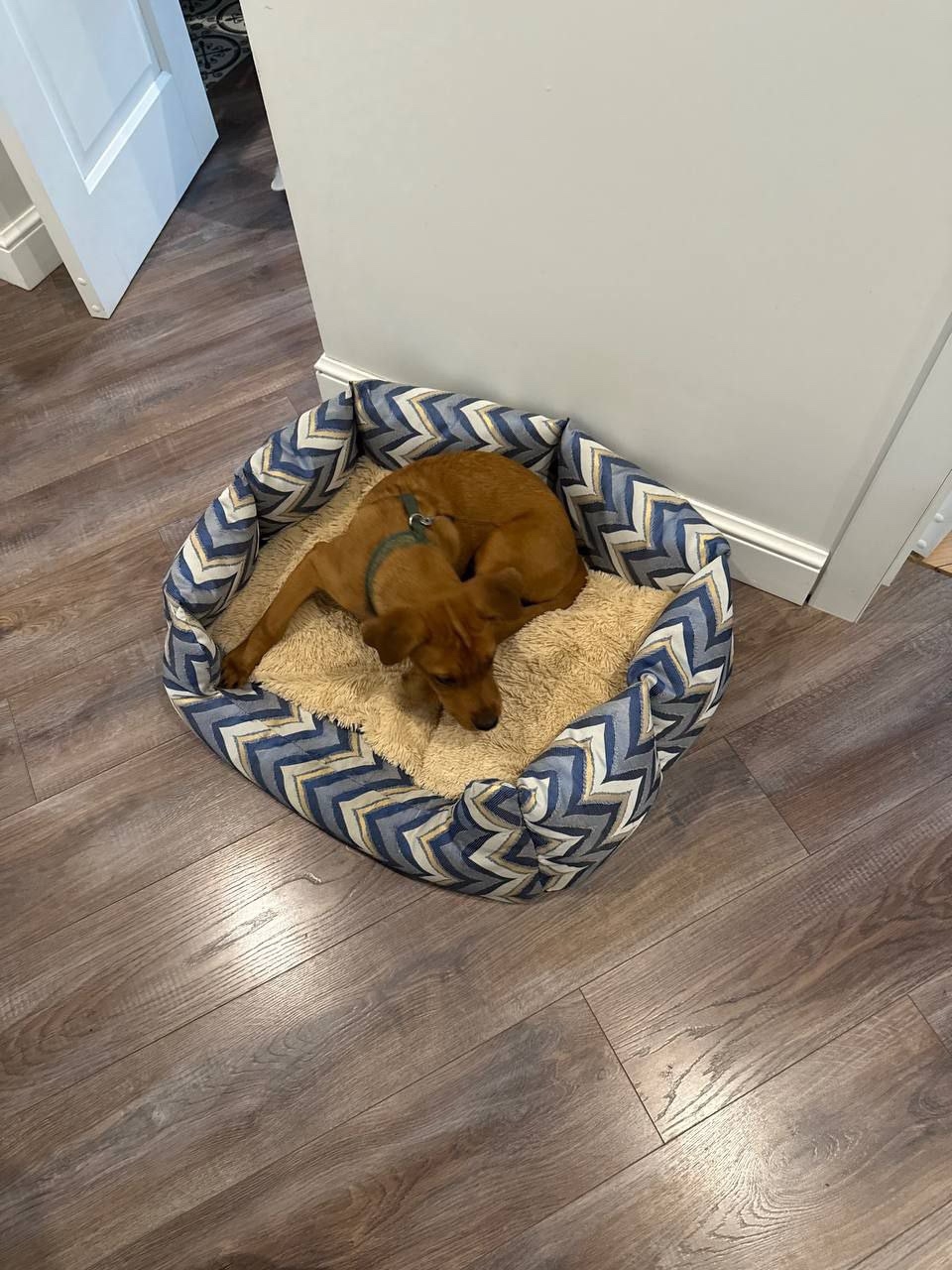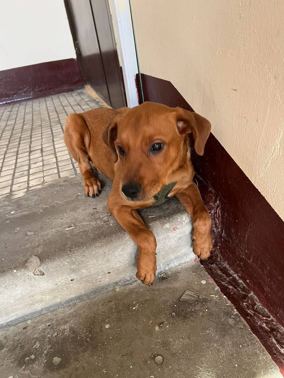 Очаровательный рыжий щенок со шлейкой и обрывком поводка. По характеристике ветеринары в районе полугода, без клейма и чипа.