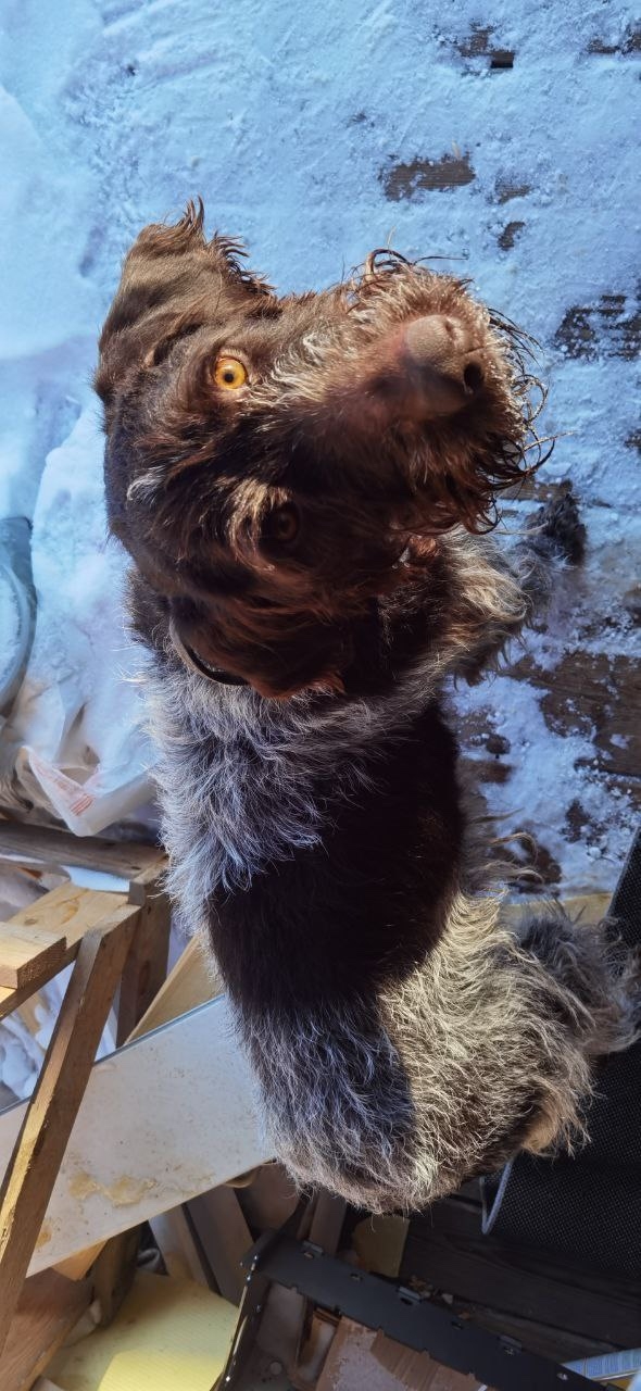 Мальчик, породы дратхаар, шоколадный с седой жетской шерстью , большой длинаык лапы, морда с бородой уши висячие