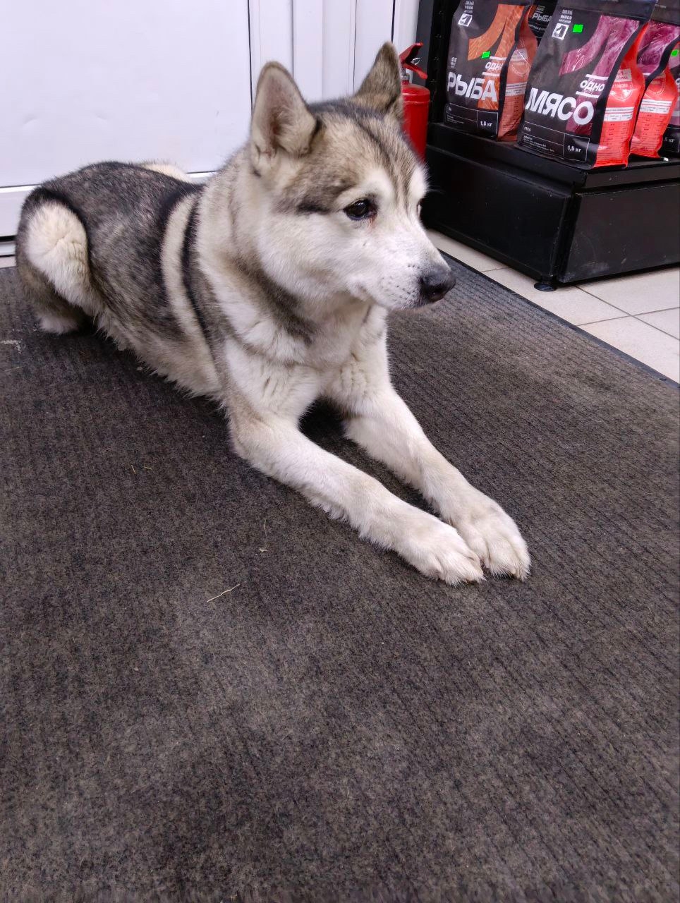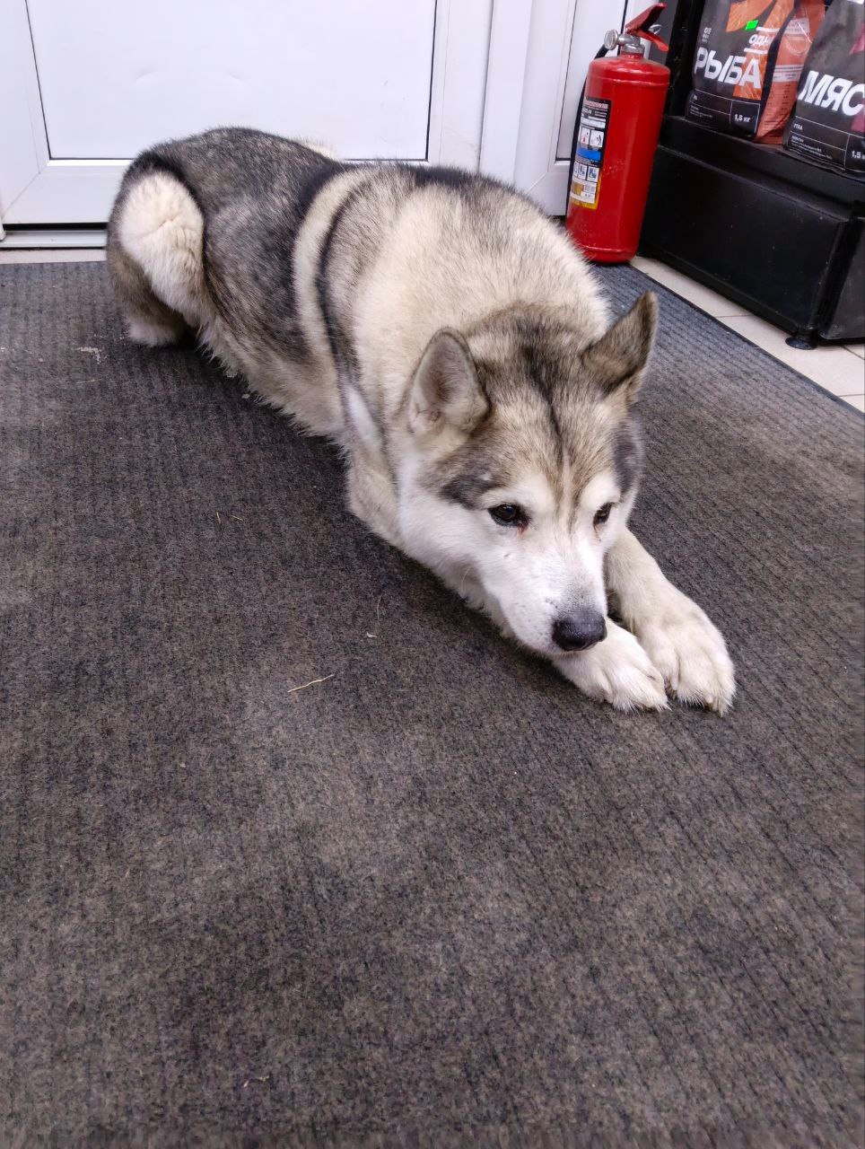 Фенотип хаски, молодой кобель без амуниции, прибился к магазину. Худой, уставший, от еды отказался. Лёг спать, как только оказался в магазине. Магазин скоро закрывается, куда потом его девать…