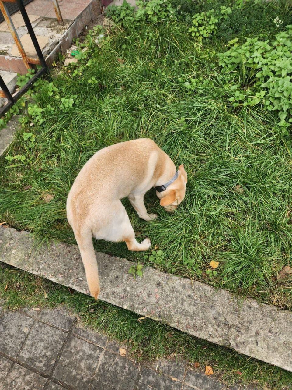 на ней серый ошейник, очень ласковая и дружелюбная. карие глаза
