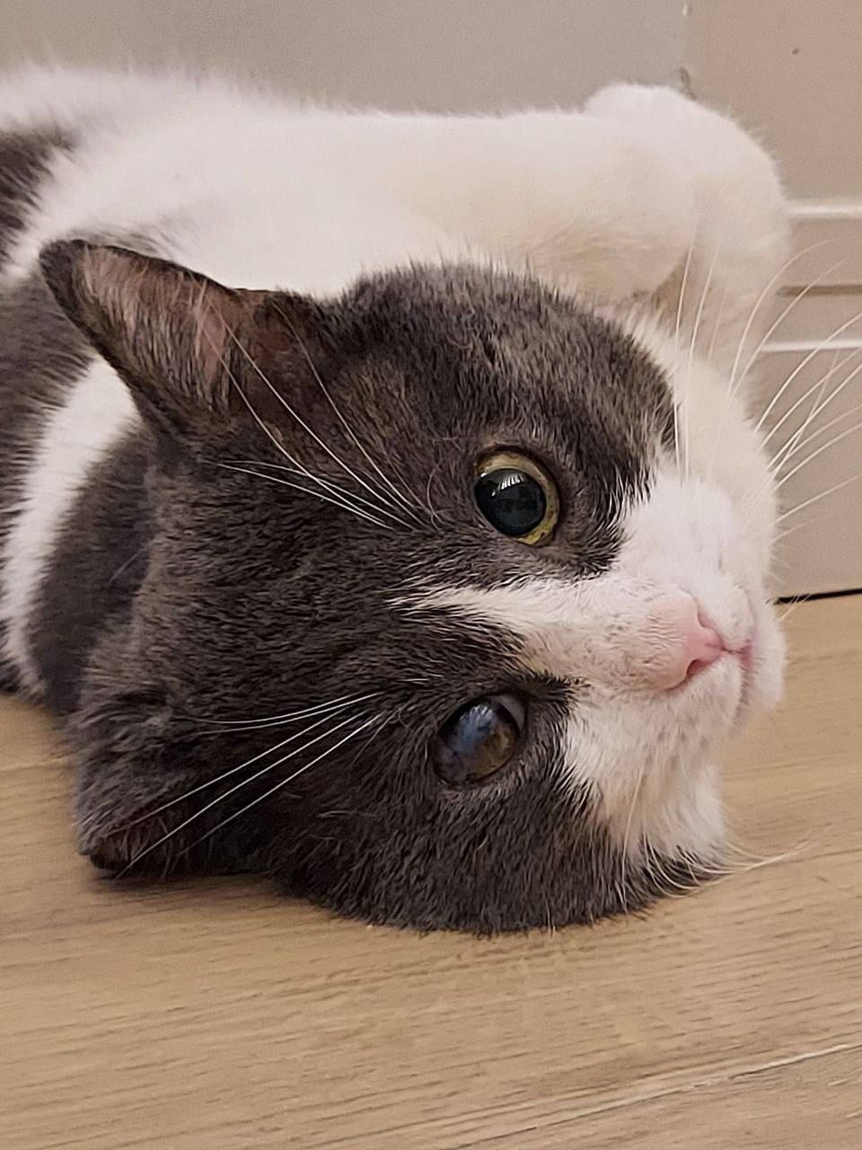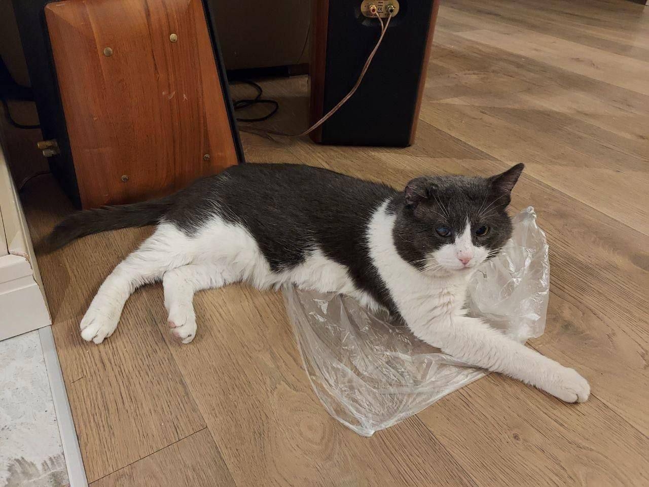 12 лет, беспородный, голубой биколор (серый с белыми пятнами), правый глаз слепой, правое ухо меньше левого. Амуниции и чипа нет, не кастрирован.