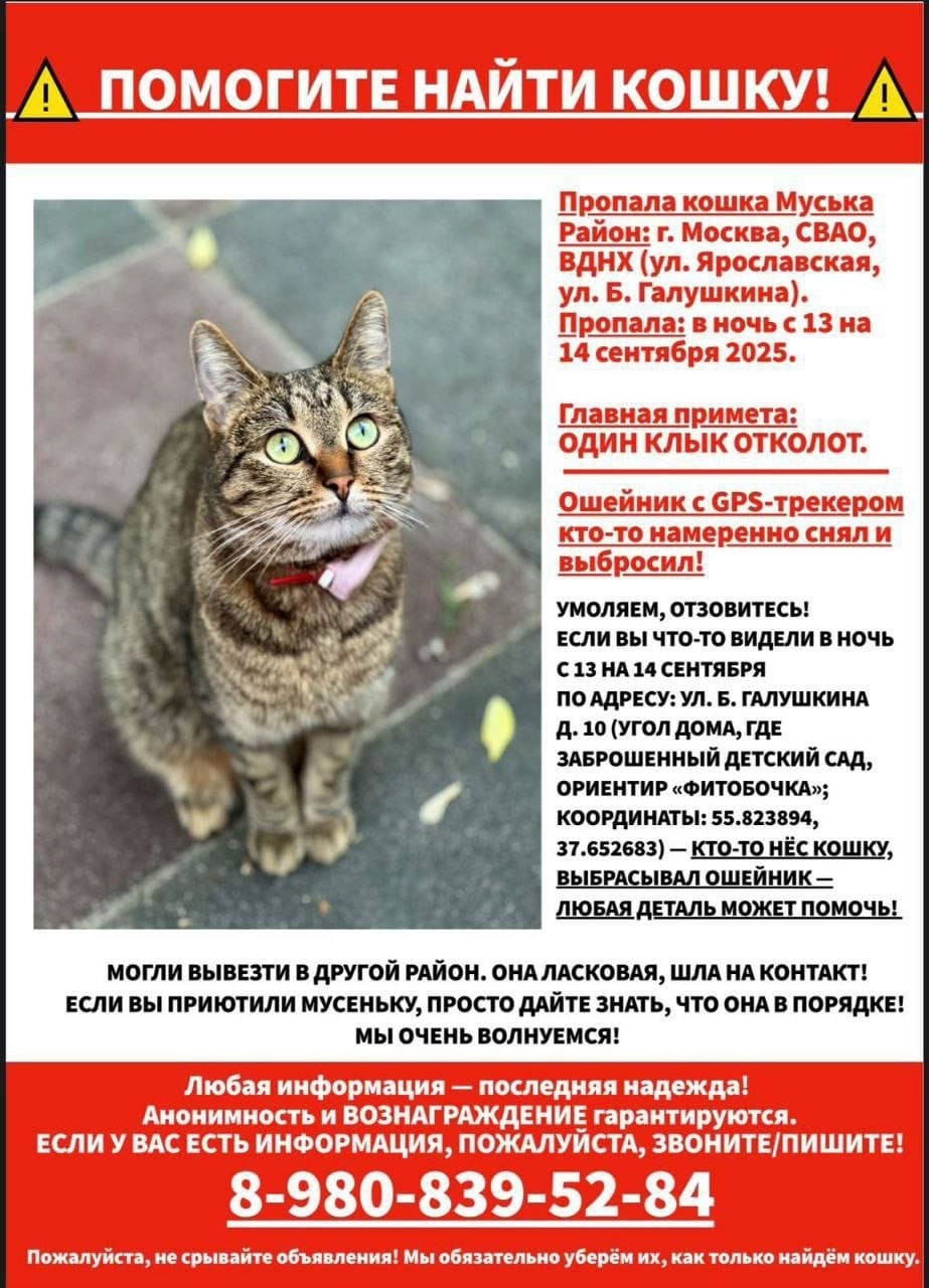 ⚠️ Пропал(а) кошка 📍 Москва ВДНХ, Ул Ярославская, Ул Галушкина 13..