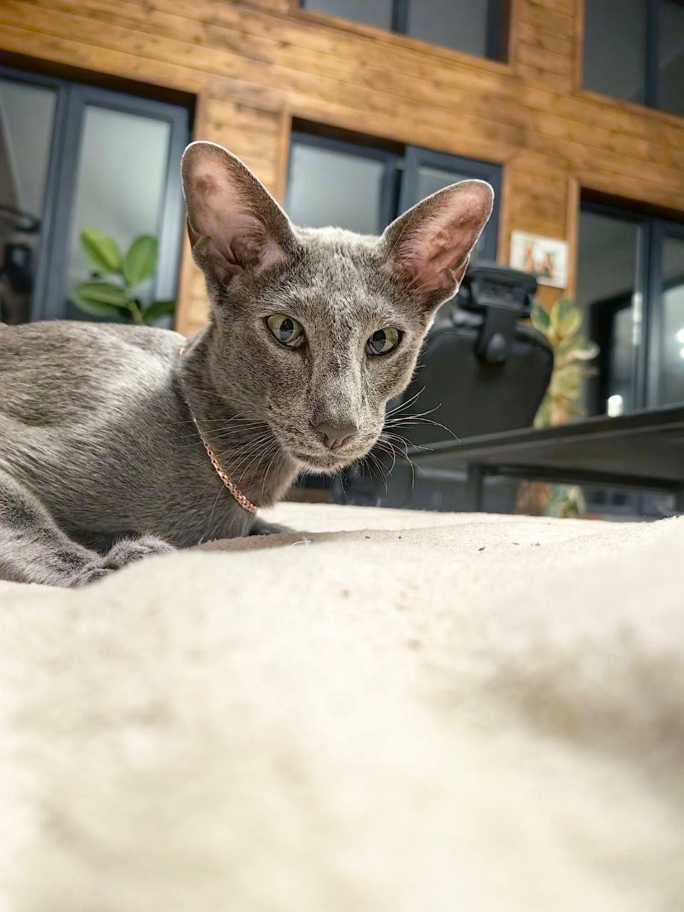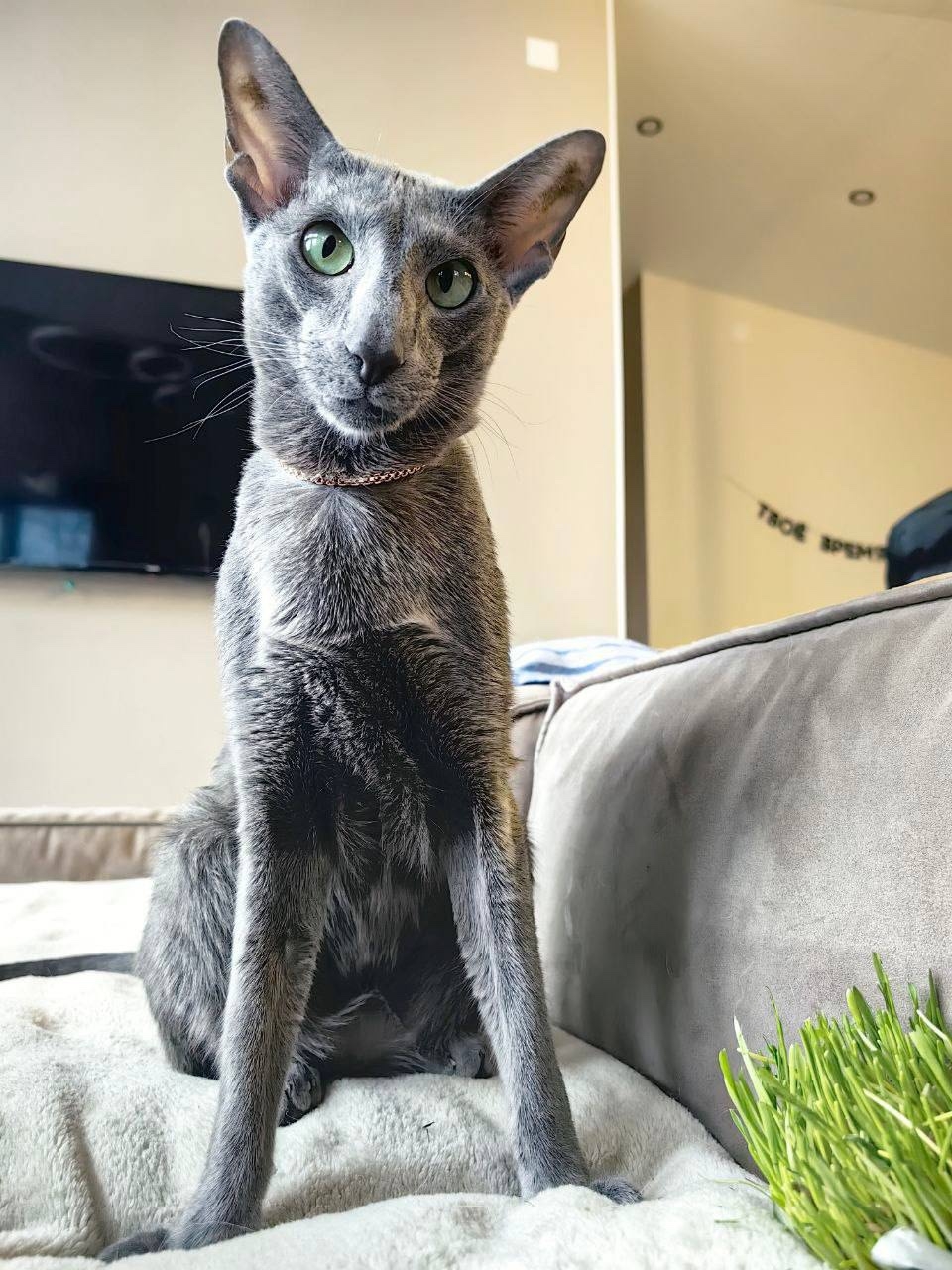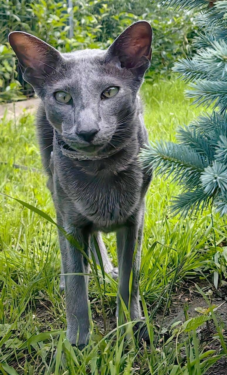 Серый ориентал, 2,5 года, кастрированный, шерсть короткая, гладкий, большие уши, разговаривает как человеческий ребенок. Прыгает на плечи. Обожает резинки для волос.