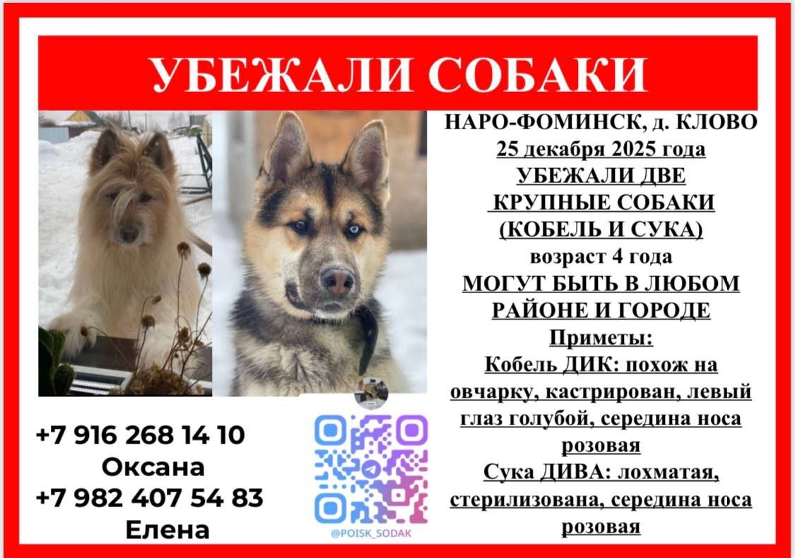 ⚠️ Пропал(а) собаки 📍 НАРО-ФОМИНСК, д. КЛОВО 25 декабря 2025..