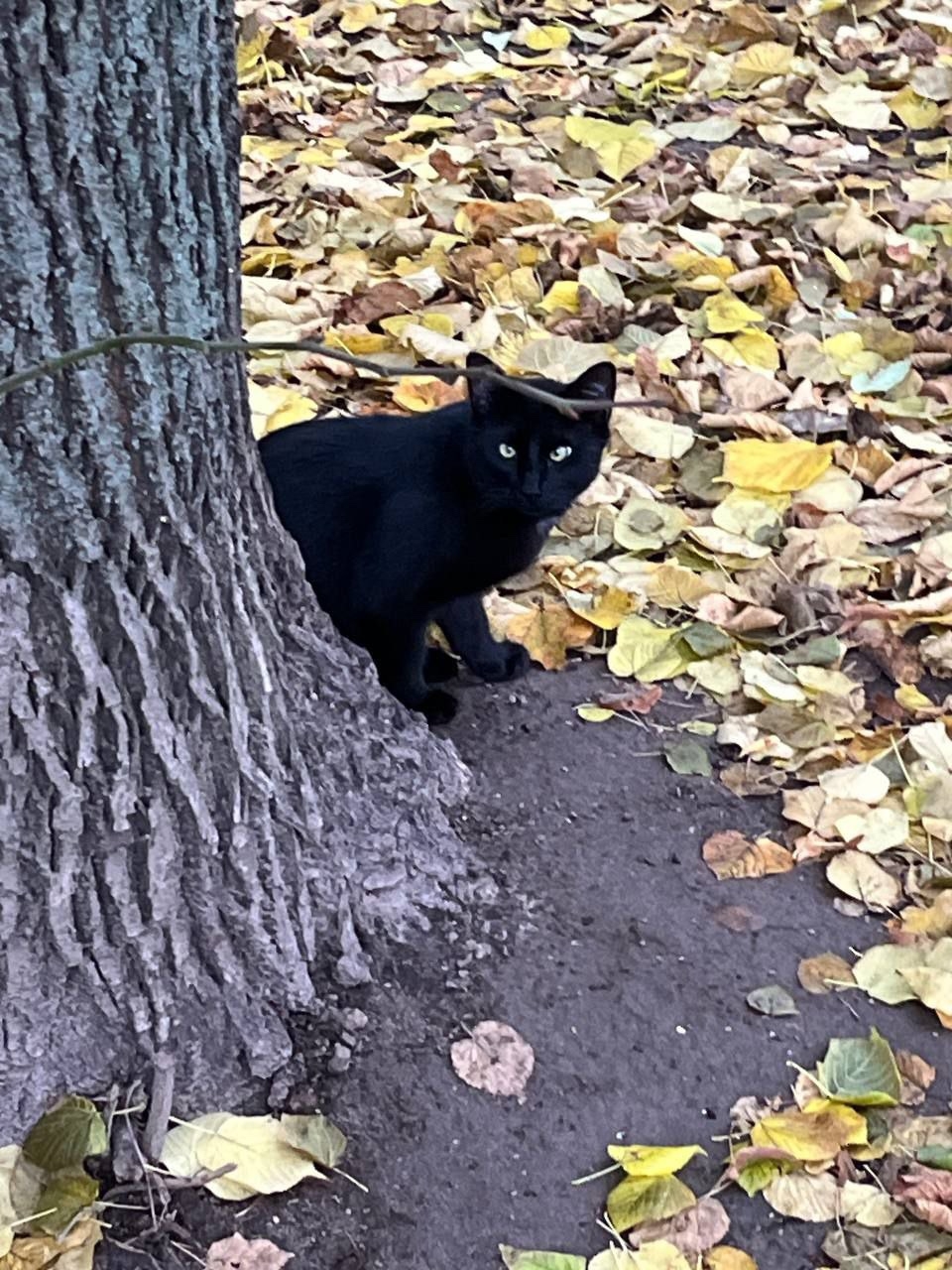 Замечена кошка или кот, черный с белым пятном на груди. Пятнышко небольшое. Глаза желтые. Никого близко не подпускает, сразу убегает. Положила ему или ей корм, но увы не притронулся пока я смотрела. Глаза косят. Худой