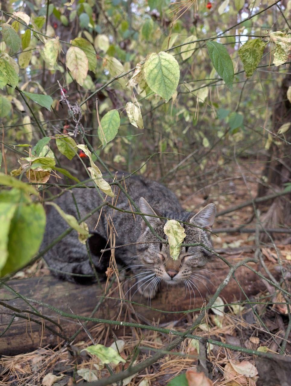 На краю леса была замечена кошка, чистая, но с клещами, будто они на ней уже неделю. К рукам подходит, ласковая, от собачьей еды отказалась, воду не пьет.