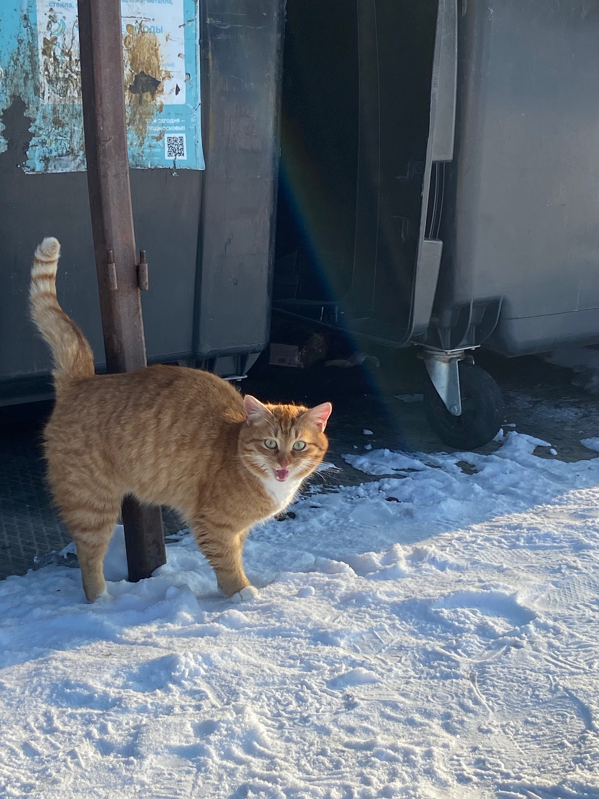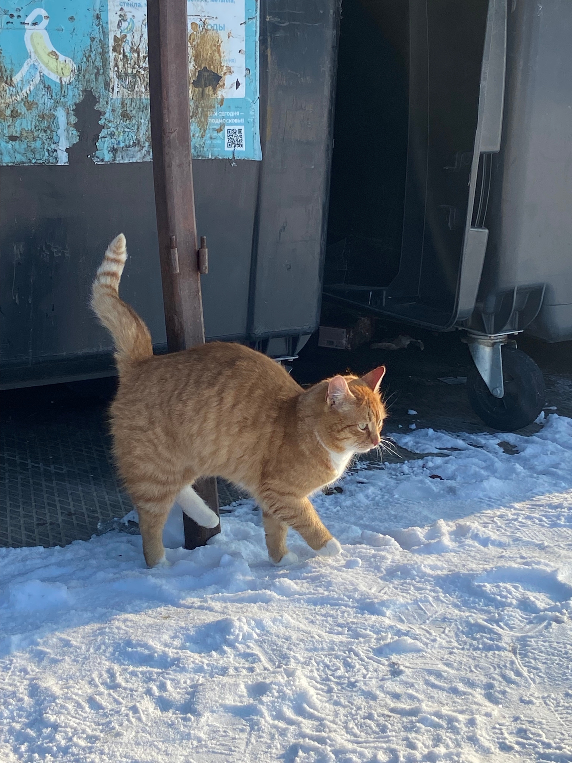 Около 2-х месяцев как прибился рыжий кот/кошка (похож на кота). Боязливый, на еду подходит. В местных чатах никто не признал.