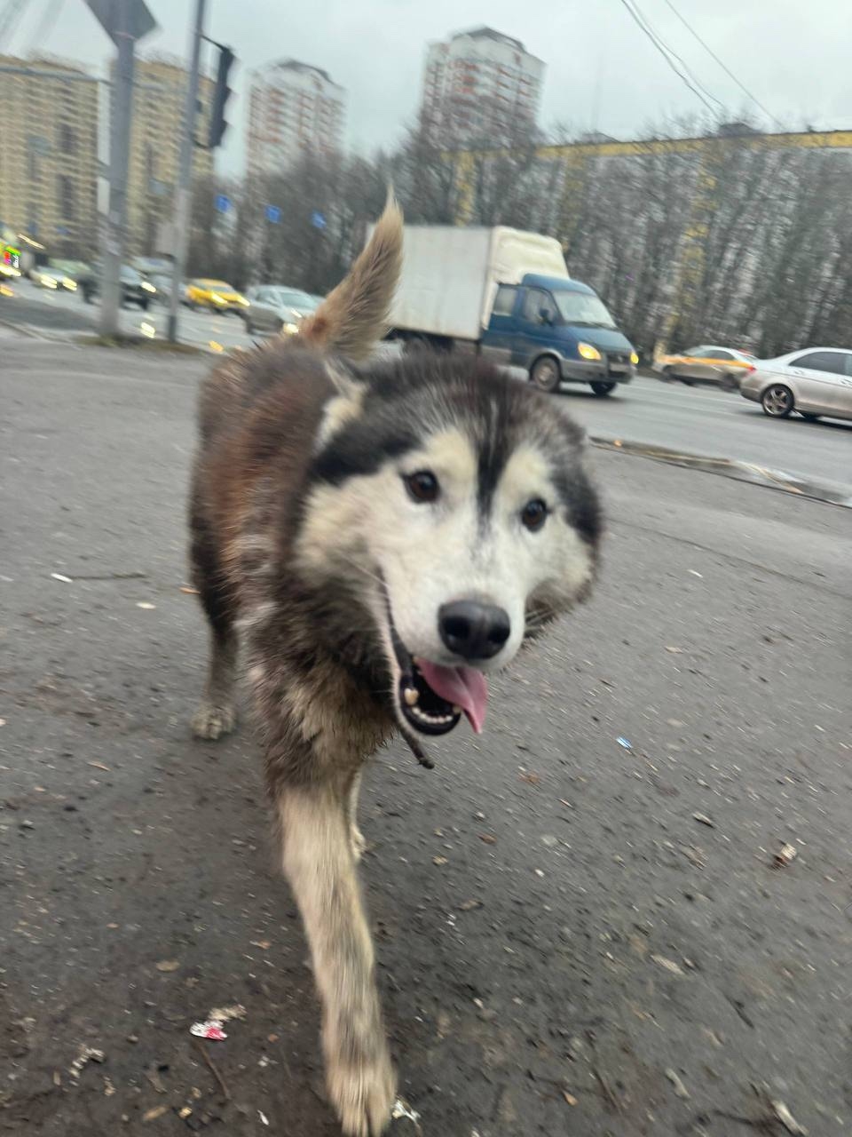 Замечено собака с ошейником. Порода хаски. Очень ласковая, пристает ко всем людям.