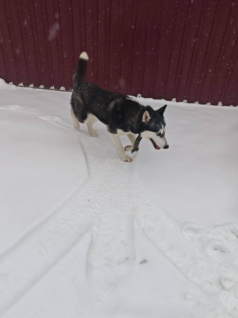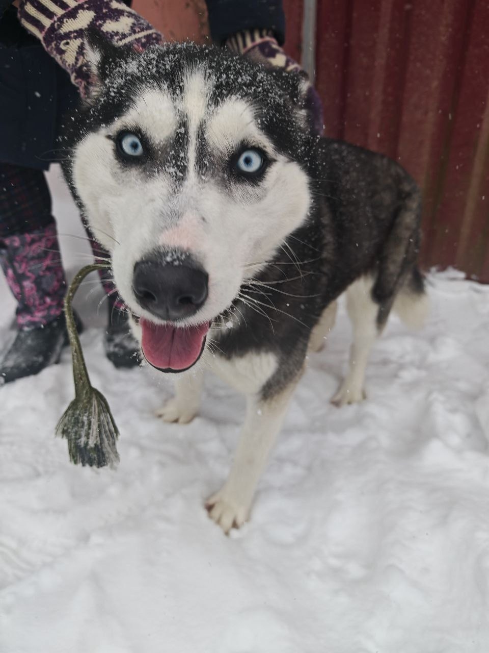 Замечена собака, хаски, молодая, очень ласковая, на шее зелёный брезентовый порванный ошейник