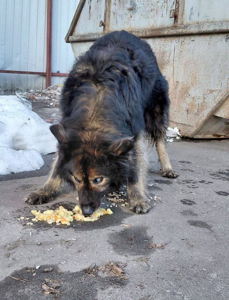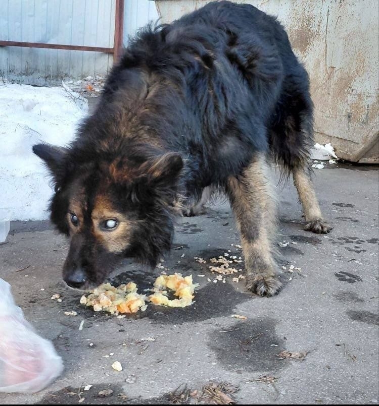 Собака прибилась пару месяцев назад,приходит покушать. Пол и возраст не известны,предположительно,слепая на оба глаза ,есть ошейник.