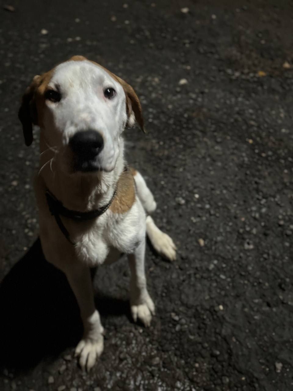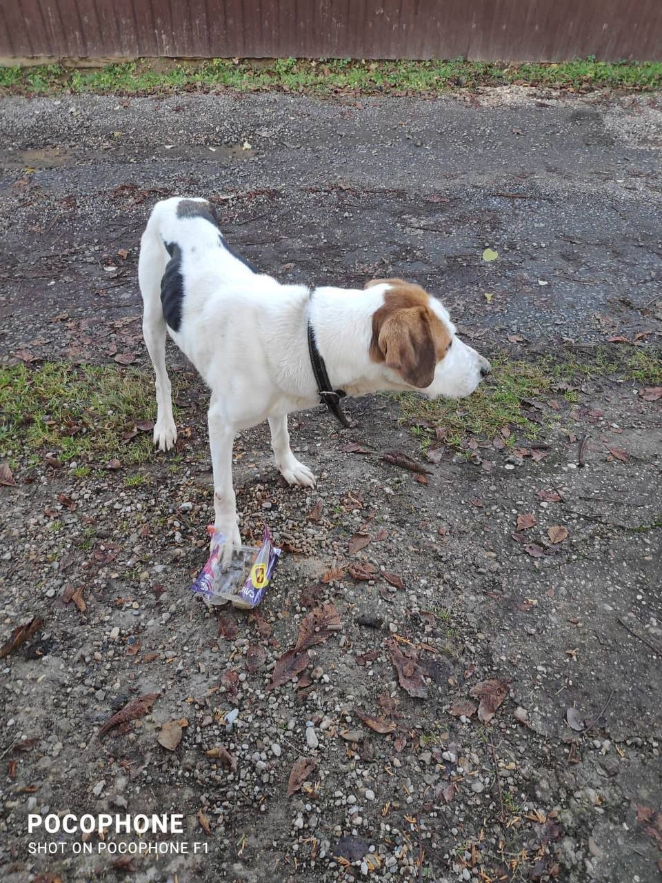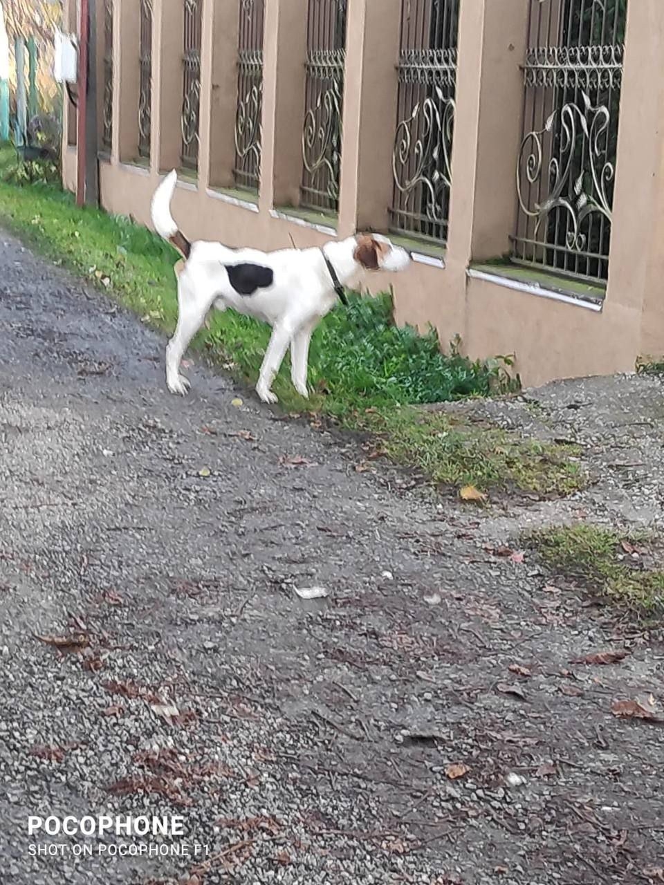 Похож на русскую пегую гончую, молодой, почти щенок, кобель, белый с коричневыми пятнами, ошейник.