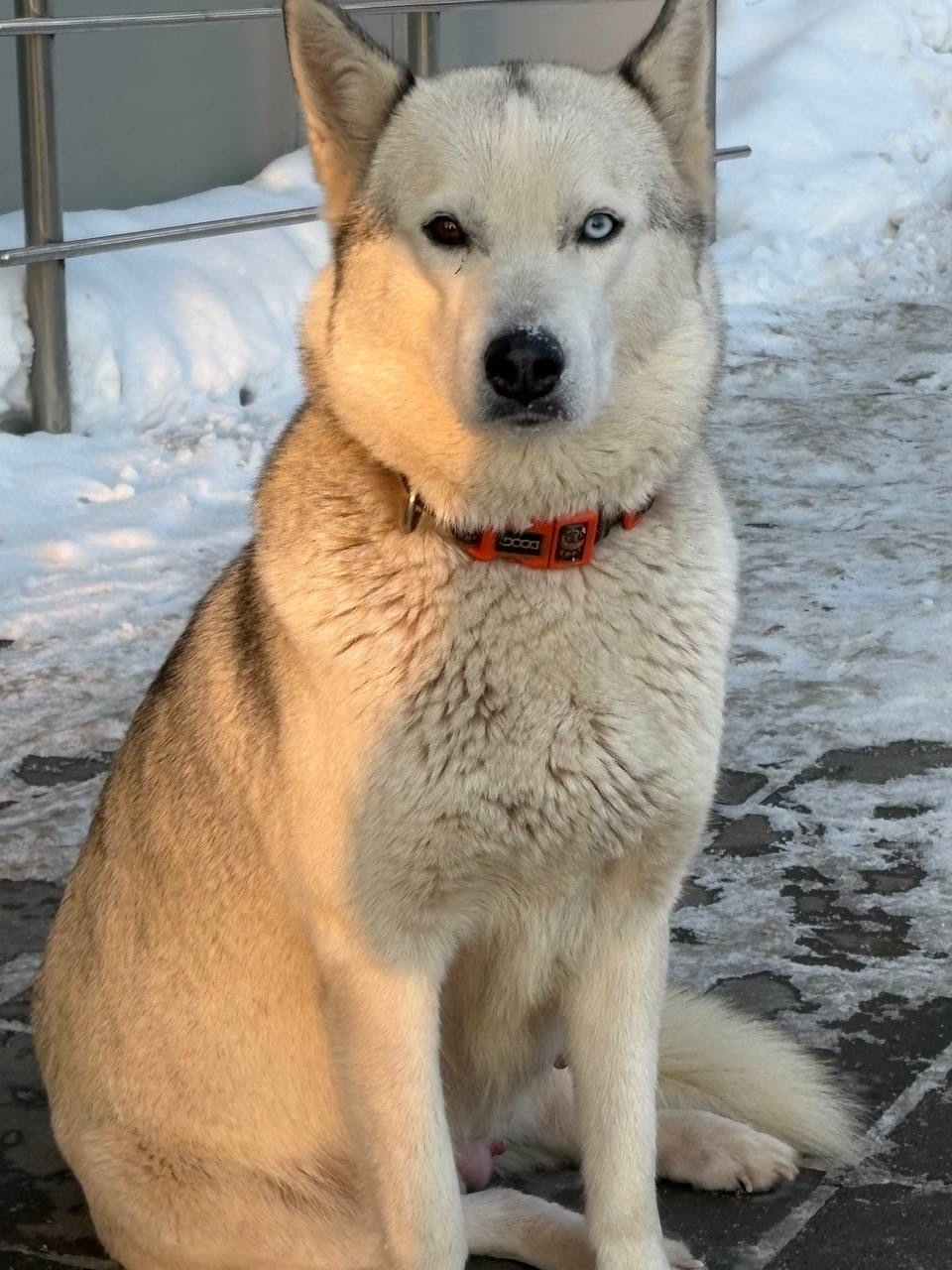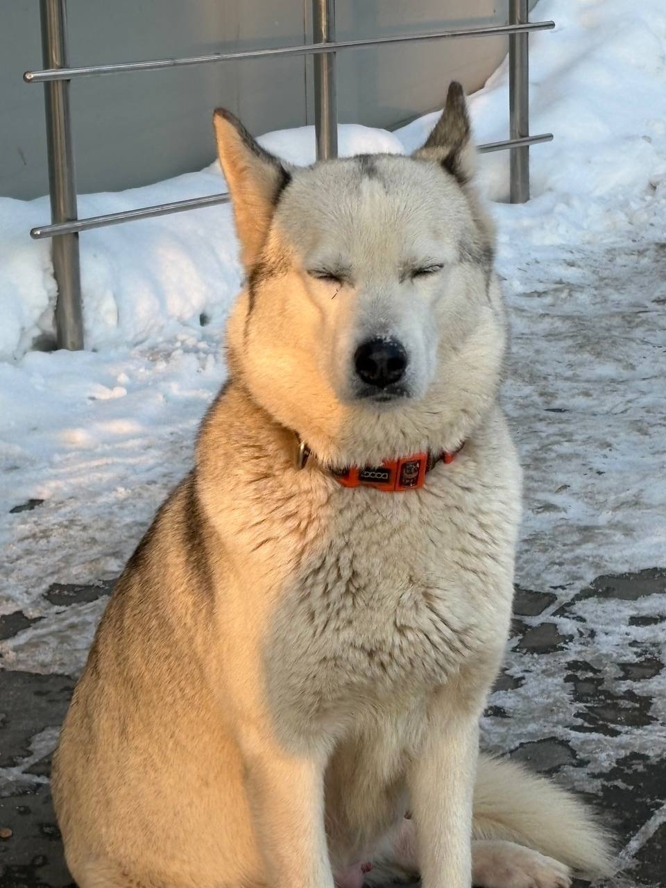 Замечена собака, хаски, по всей вероятности ощенившаяся (увеличенные молочные железы), окрас светло-серый, один глаз голубой, второй карий, в красно-черном тряпочном ошейнике. Часть предложенных сосисек съела, две штуки прихватила и унесла с собой, видимо для щенков. Собака не придержана