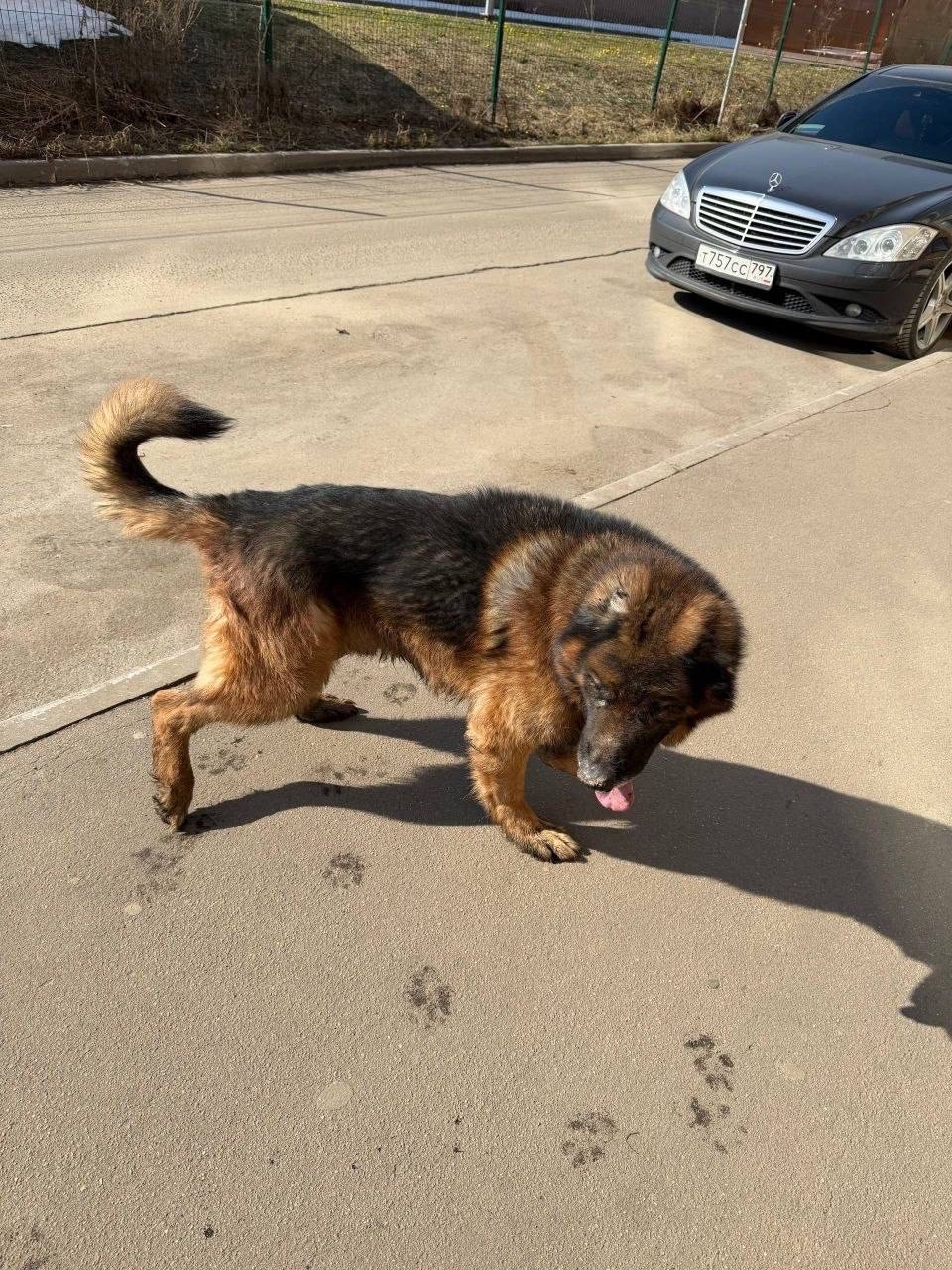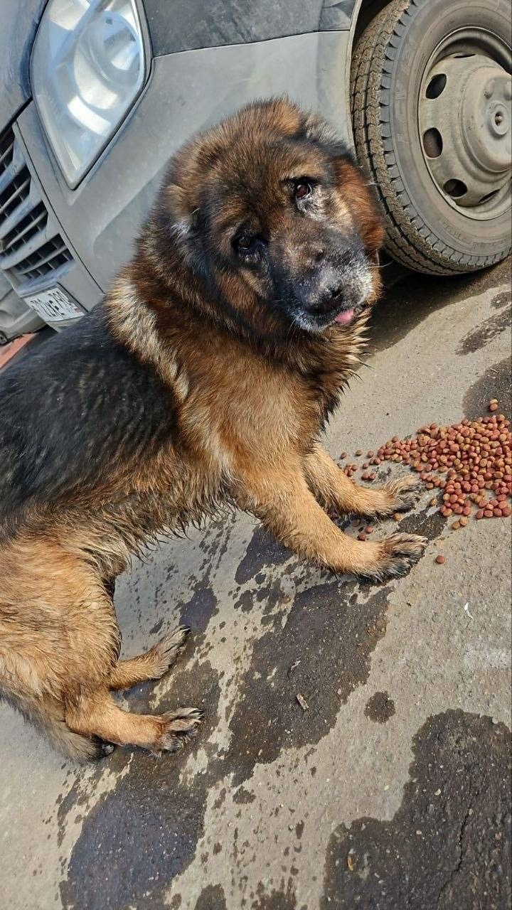 С самого утра скитается старичок немецкая овчарка. Уши купированы или обморожены. Парень на суете, наворачивает круги, чуть поел и опять ходит и ходит. В стрессе и напуган.