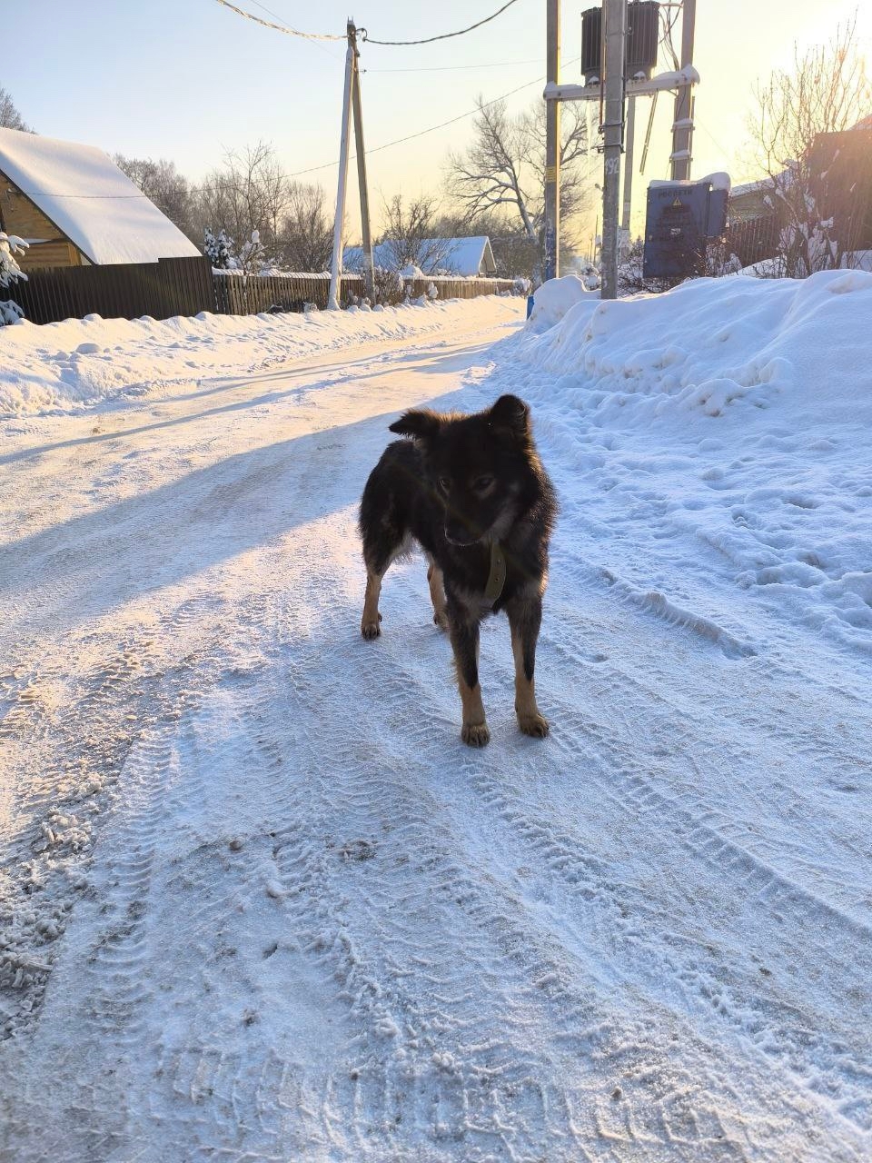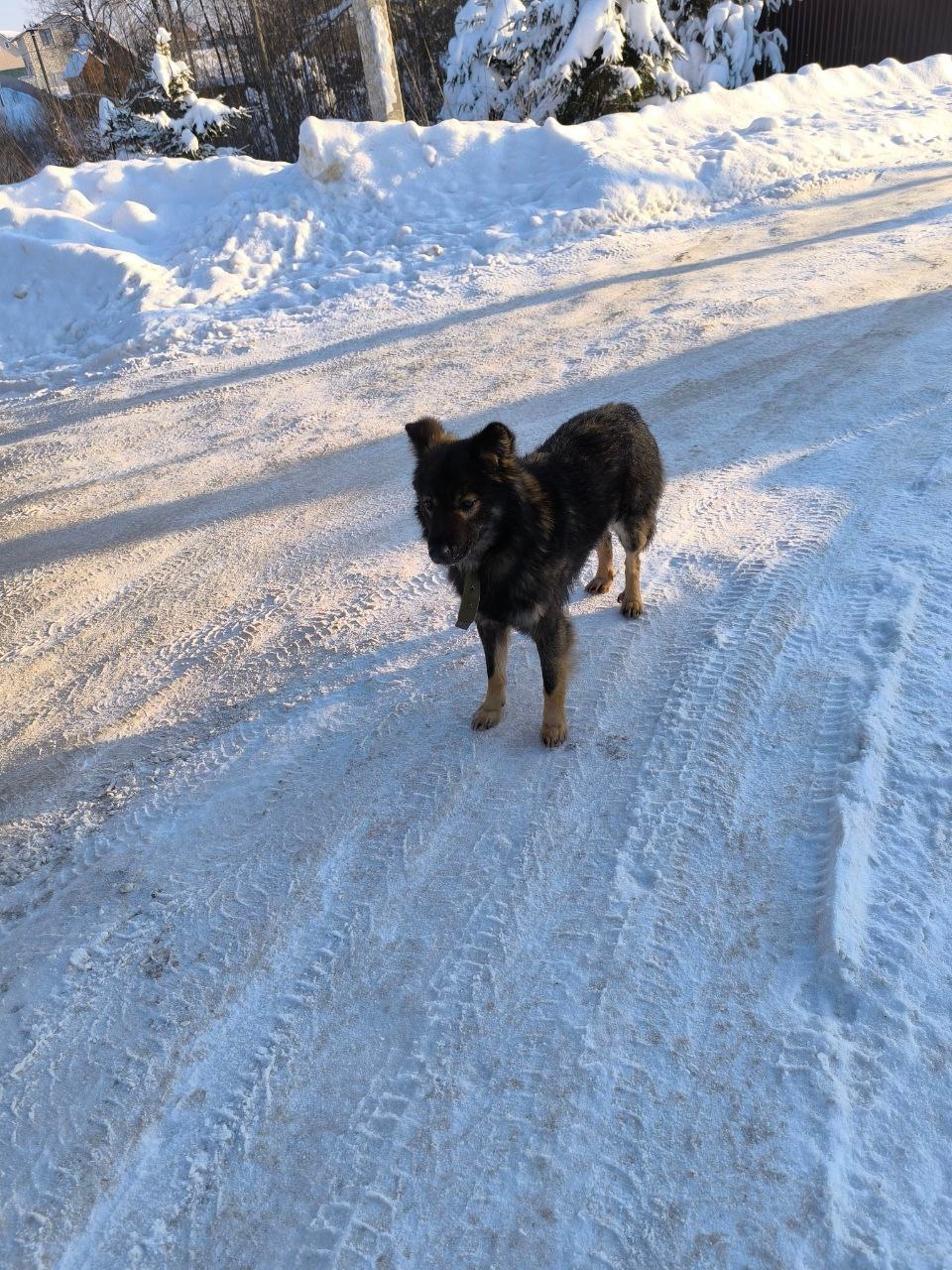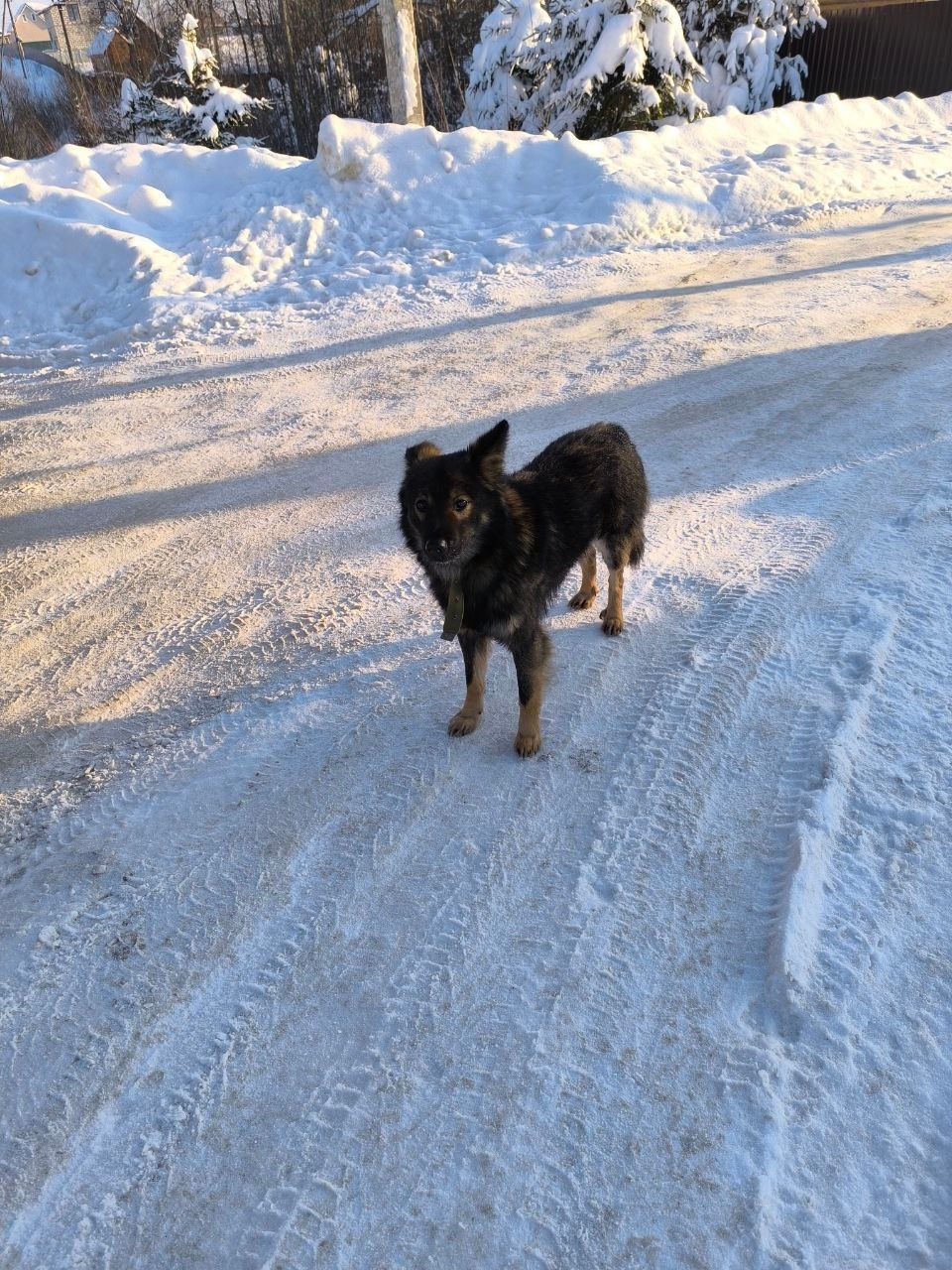 Похоже мальчик, чёрный, лохматый, овчарочного типа, в зелёном брезентовом ошейнике, не подходит, боится.