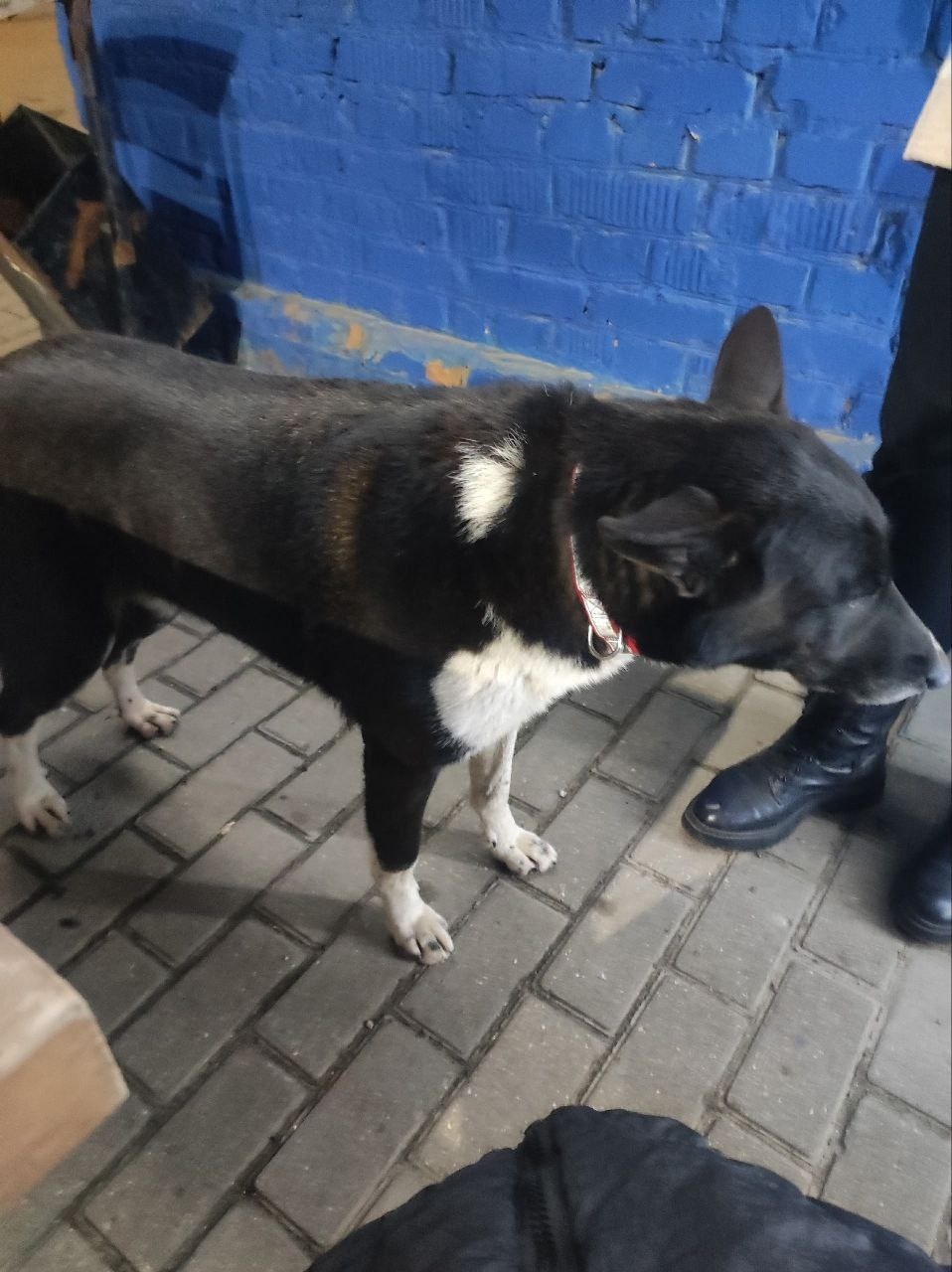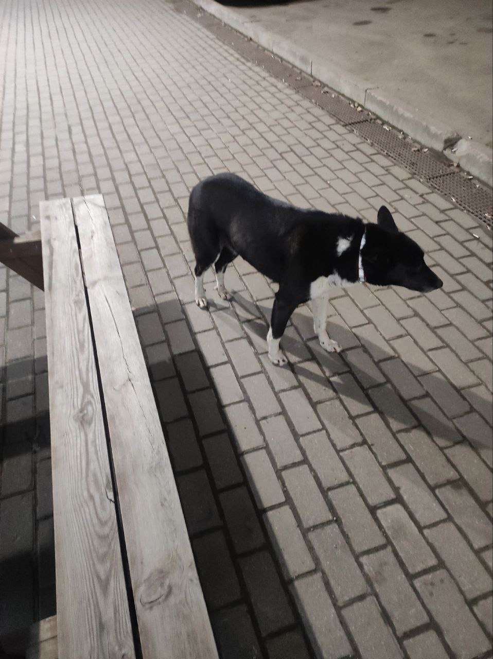 Собака сидит уже больше трёх часов. Хочет в тепло, идёт к людям, в ошейнике, адресника нет.