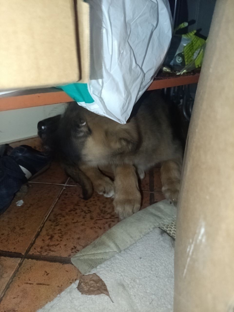 Зашел в двор щенок, забежал в беседку греться. Крупный, морда черная, похож на щенка овчарки. Кто потерял?