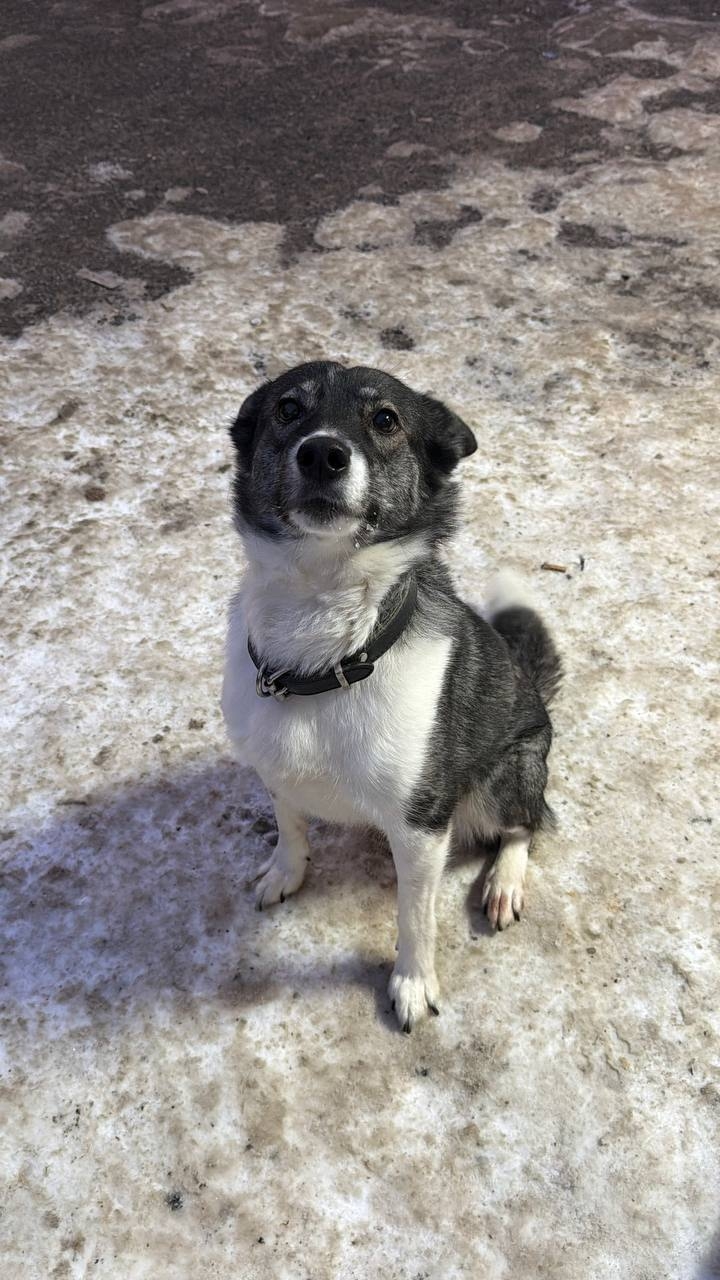 Девочка в ошейнике без адресника. Окрас серо-белый, размер по колено