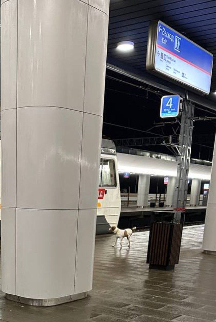 Замечена собака, похожа на Джек Рассела, салатовый ошейник. Бегает по платформе