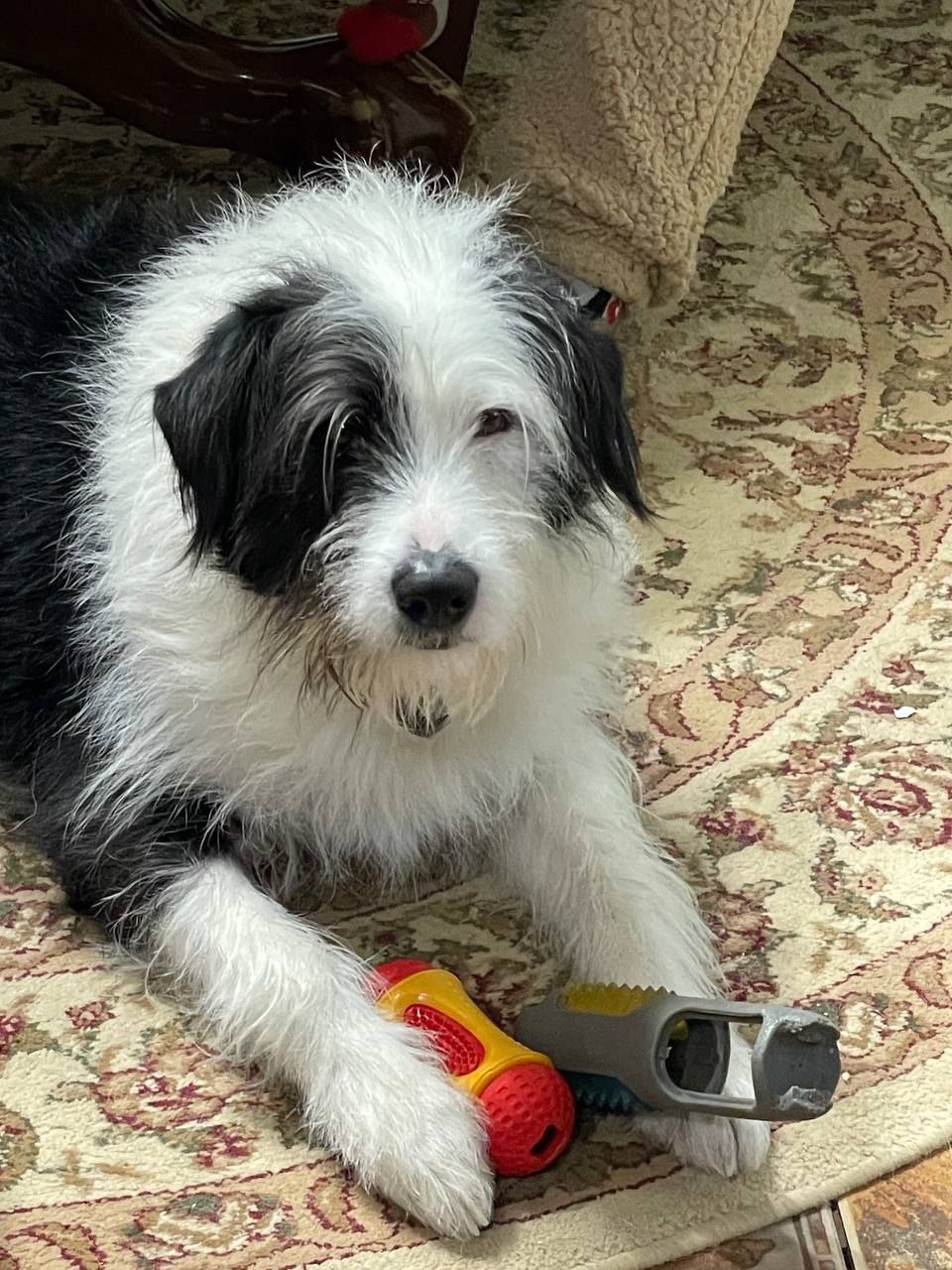Яркий черно- белый окрас, лохматый. Два ошейника и адресник ( мог потерять). Кличка Бим.