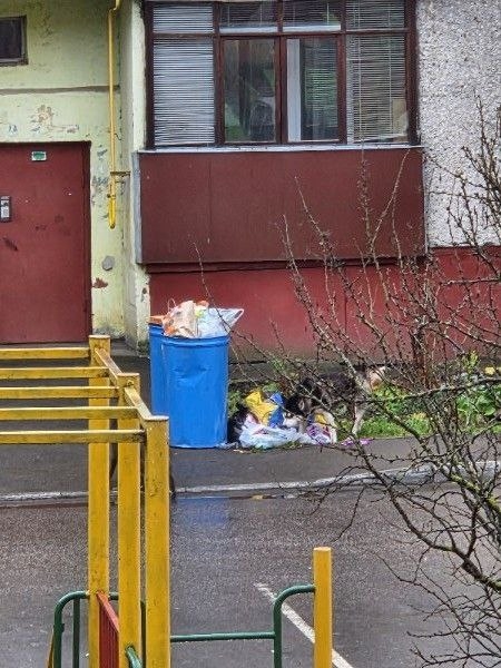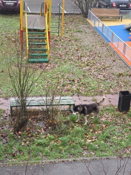 Хаски, без ошейнка. Выглядит более менее ухоженно, но голодный, рылся в помойке. Кто потерял?