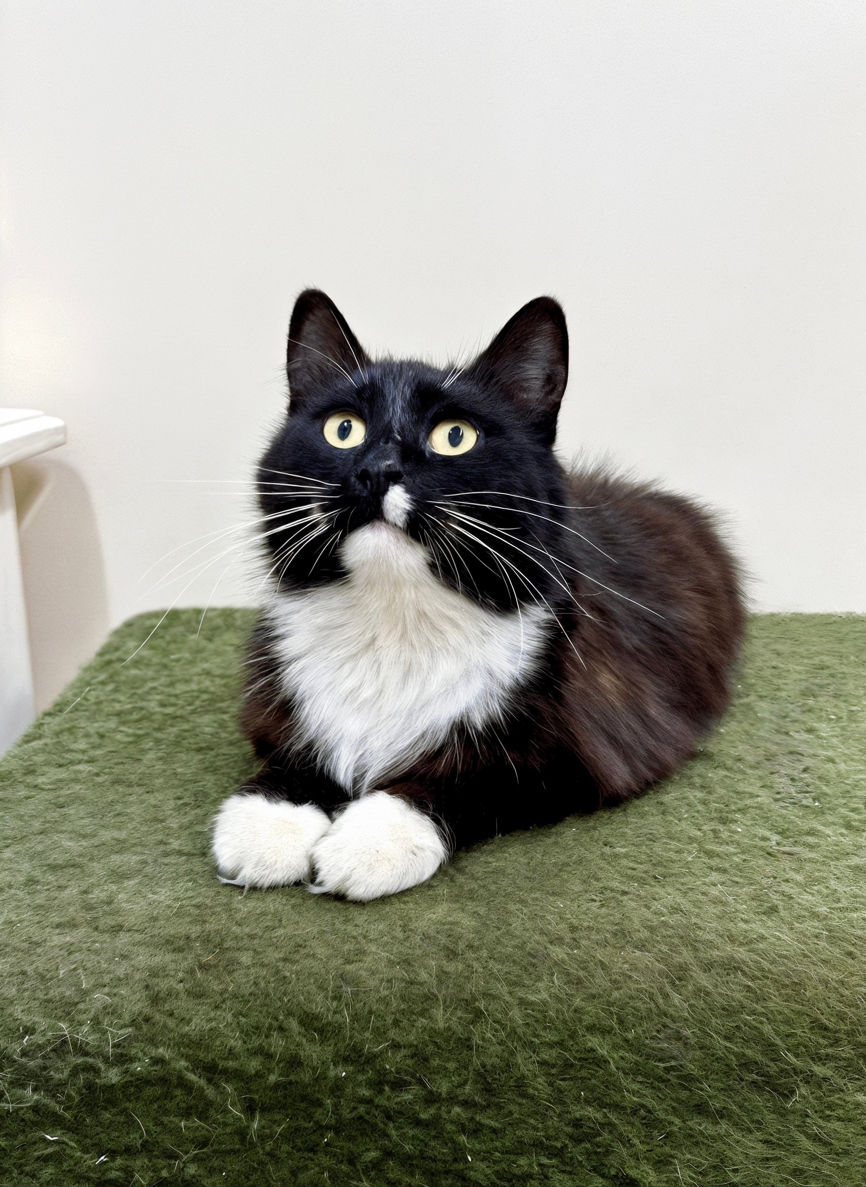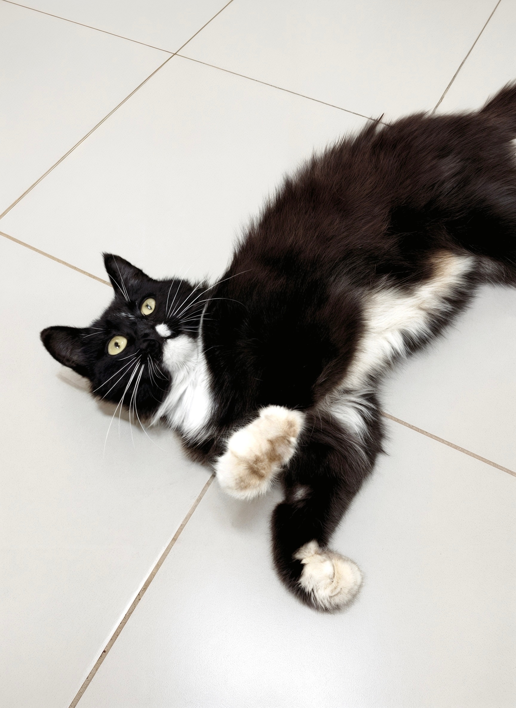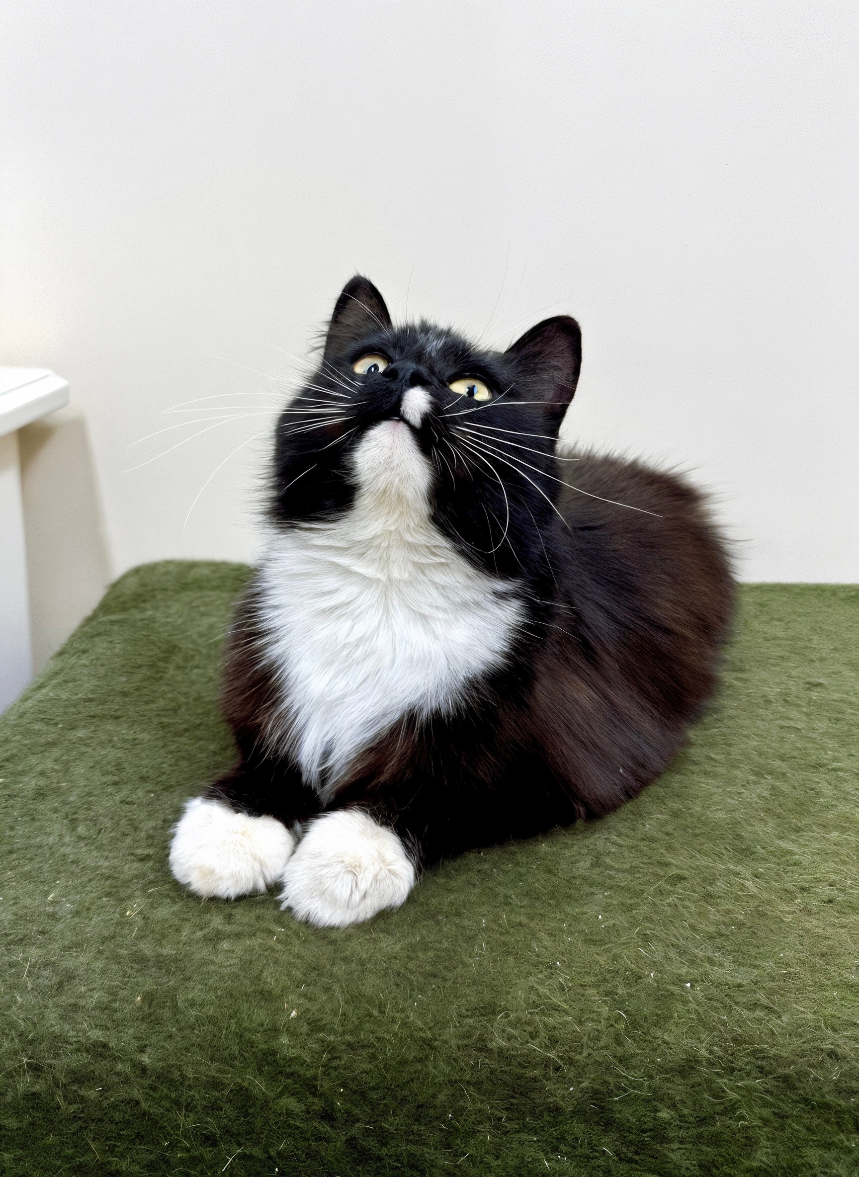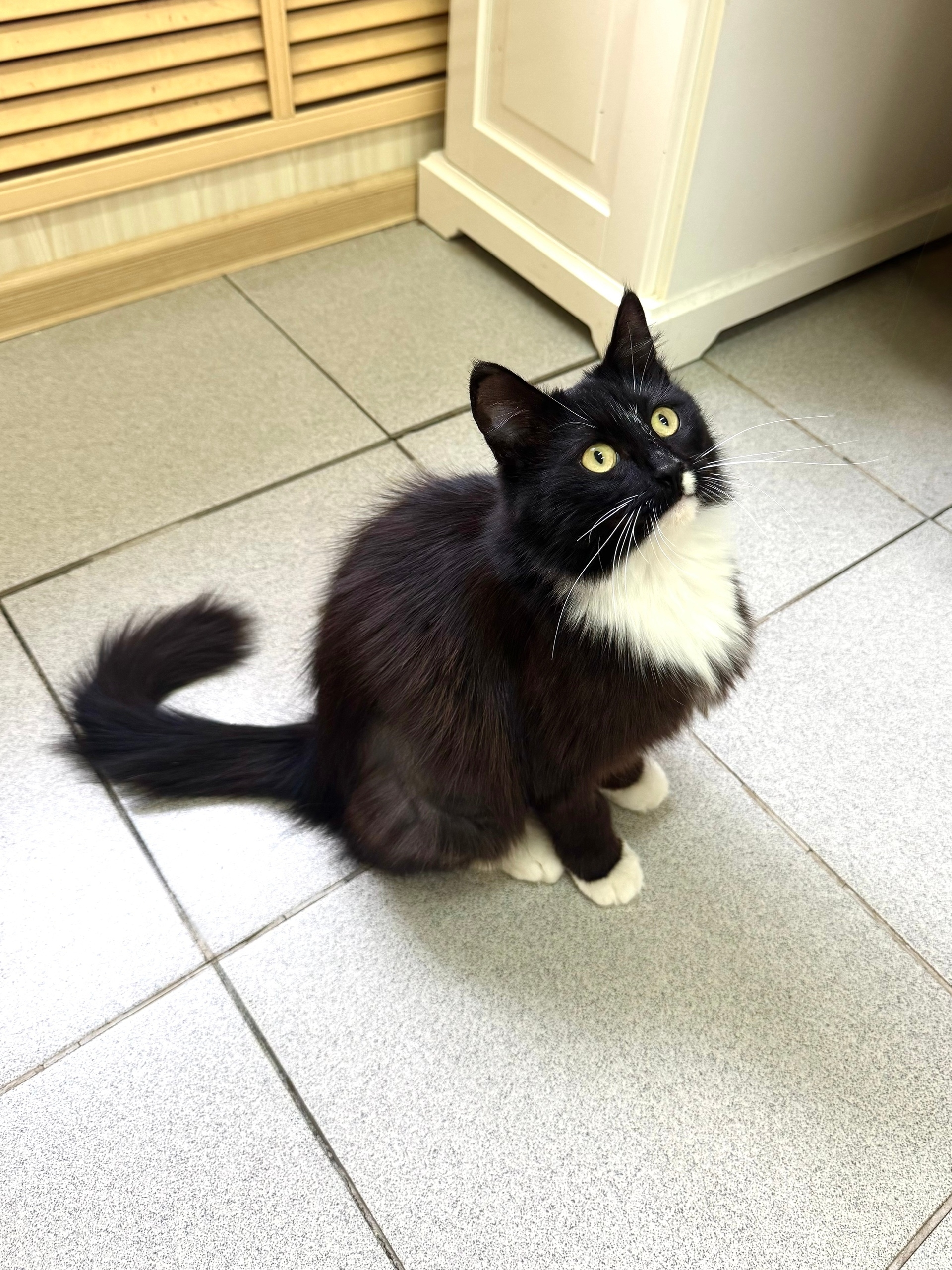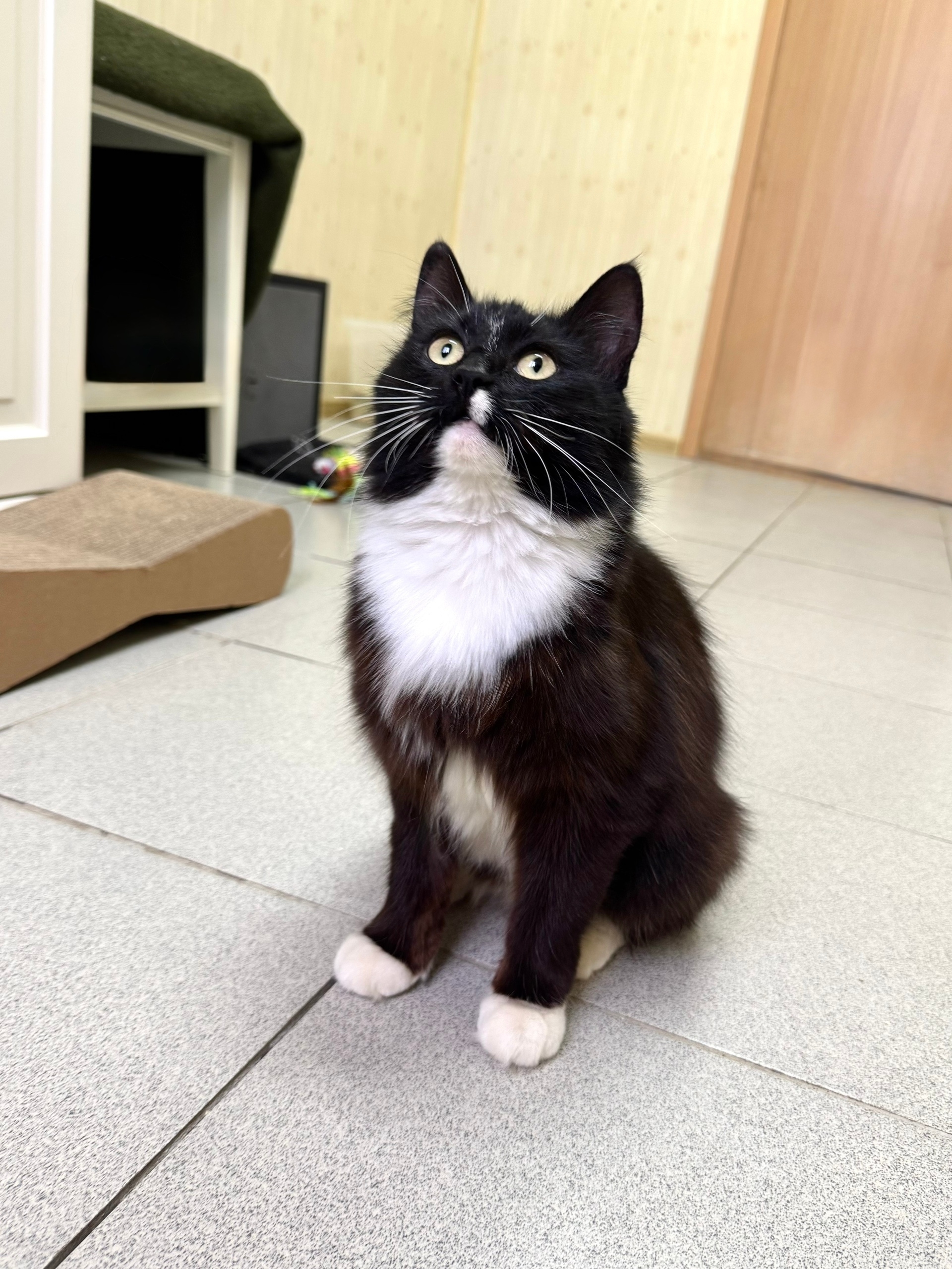 Она забавная и веселая — корчит смешные мордочки, а когда играет в удочку, прыгает как кенгуру. Проявляет внимание к человеку, трется о ноги, бодается — очень благодарная девочка.