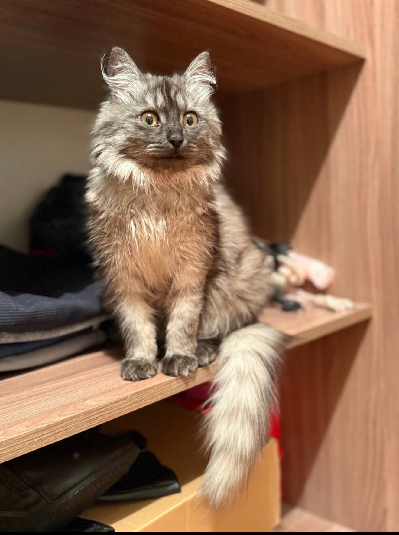 Котенок 6 месяцев, размер небольшой, на «кыс кыс» может не откликаться, окрас серый, янтарные глаза, розовый ошейник, самка.