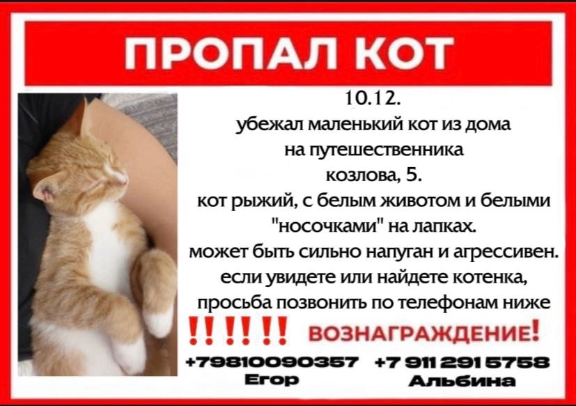 потерялся рыжий котик в районе аврова, около 416 школы. Он небольшой, подросший котенок, белые “чулочки” на лапках и белый живот. Он может быть сильно напуган, очень боится улицы