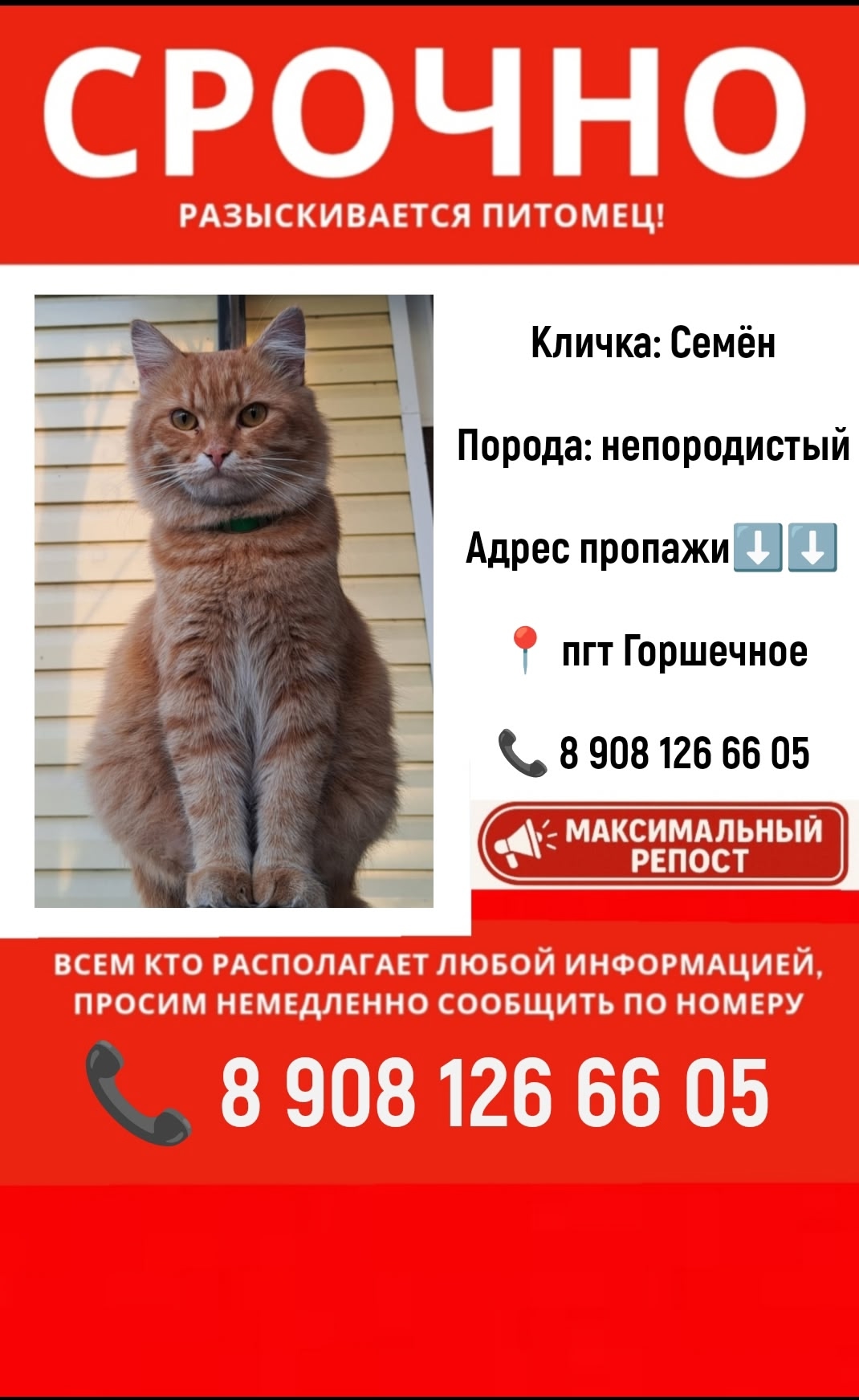 ❗️Весь Горшеченский район!!! Пропал кот. Кличка Семён. Возможно..