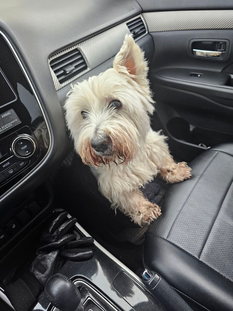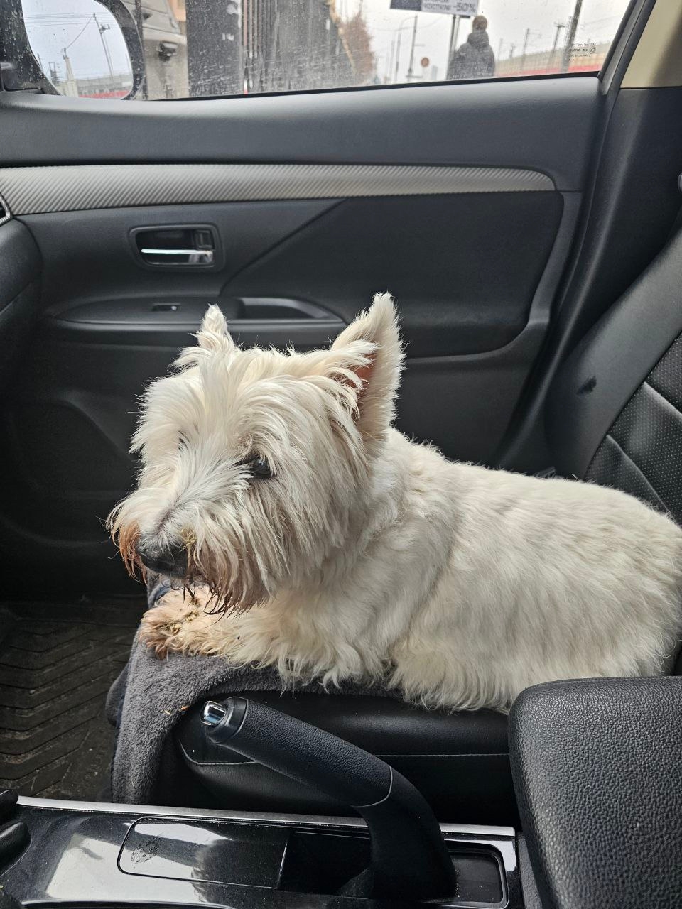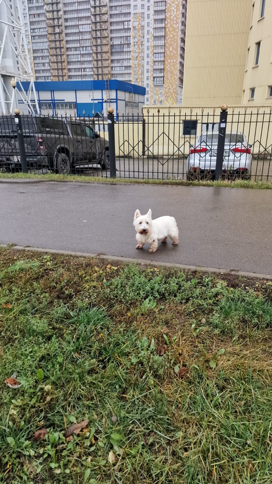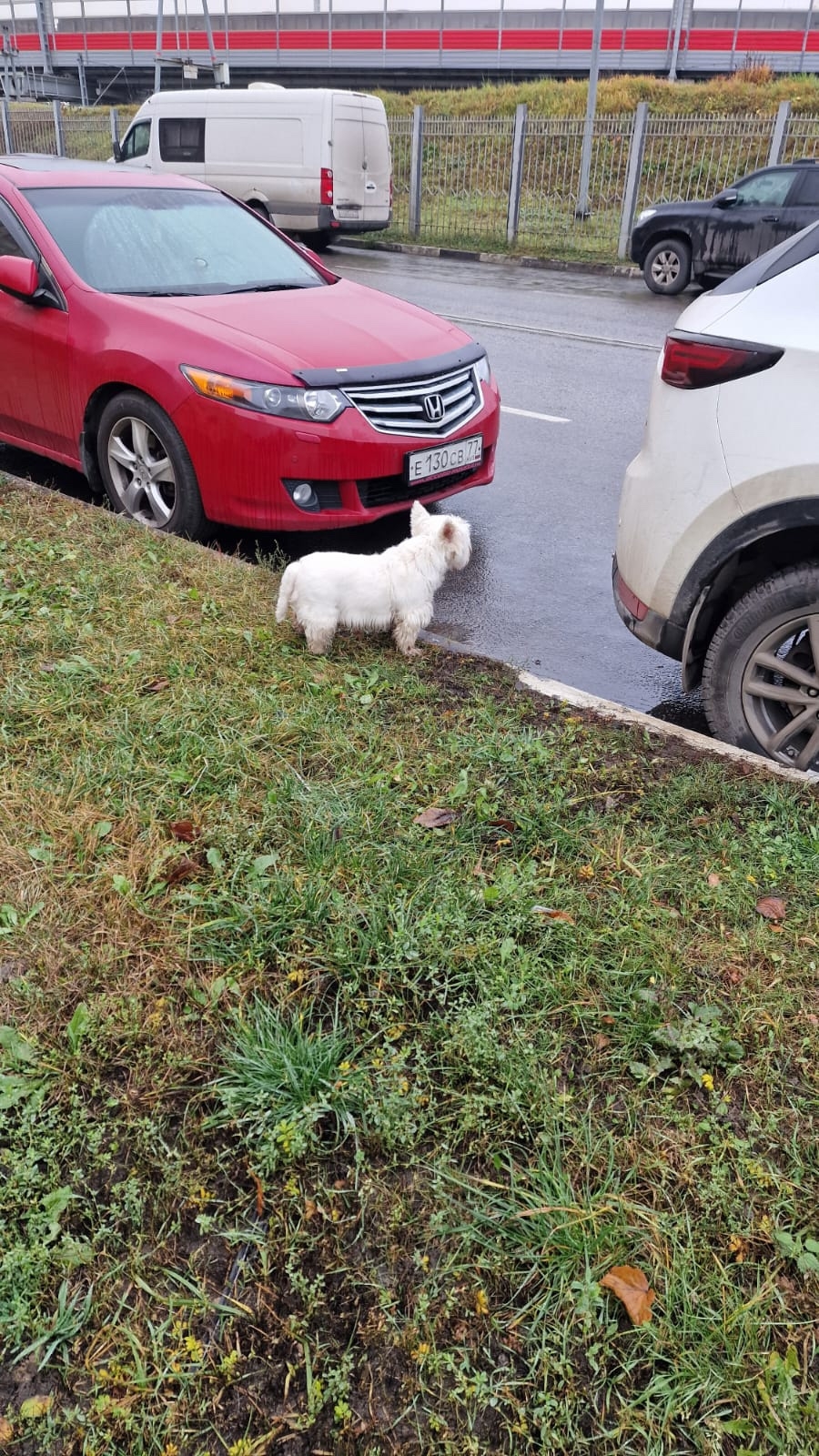 возле дороги была найдена маленькая белая собака (похожа на вест-хайленда). Она стояла одна, мокрая, грязная и очень растерянная — видно, что она потерялась и ищет своих людей.