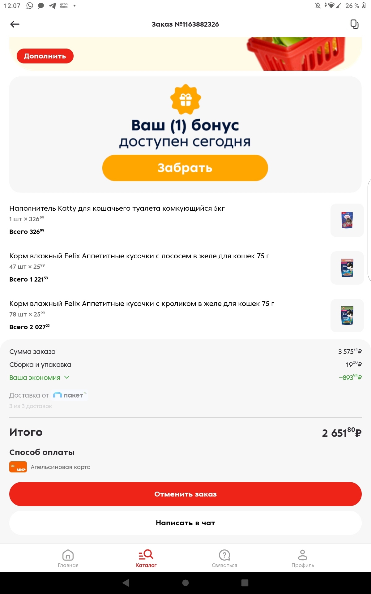 Обнаружили, что сейчас акция в Пятерочке на заказы от 2500 с доставкой, скидка 25 процентов.