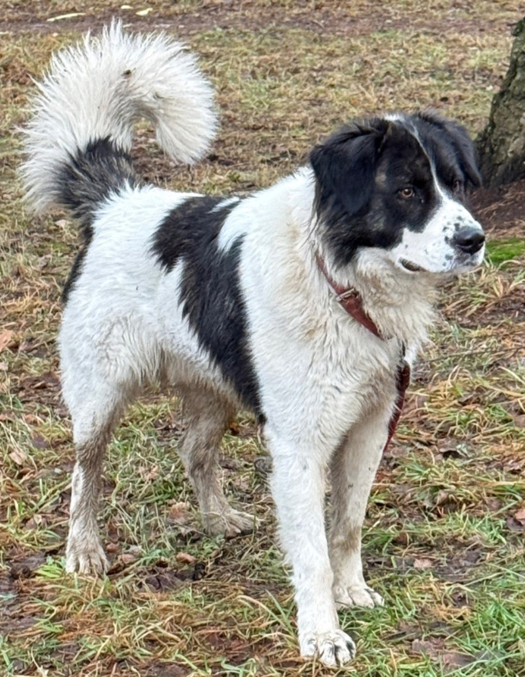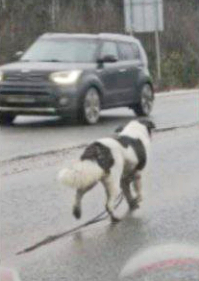 22.12. Белого окраса, с чёрными пятнами, в красном ошейнике с поводом. Бежит по проезжей части. Потерянный, в стрессе, к людям не подходит.