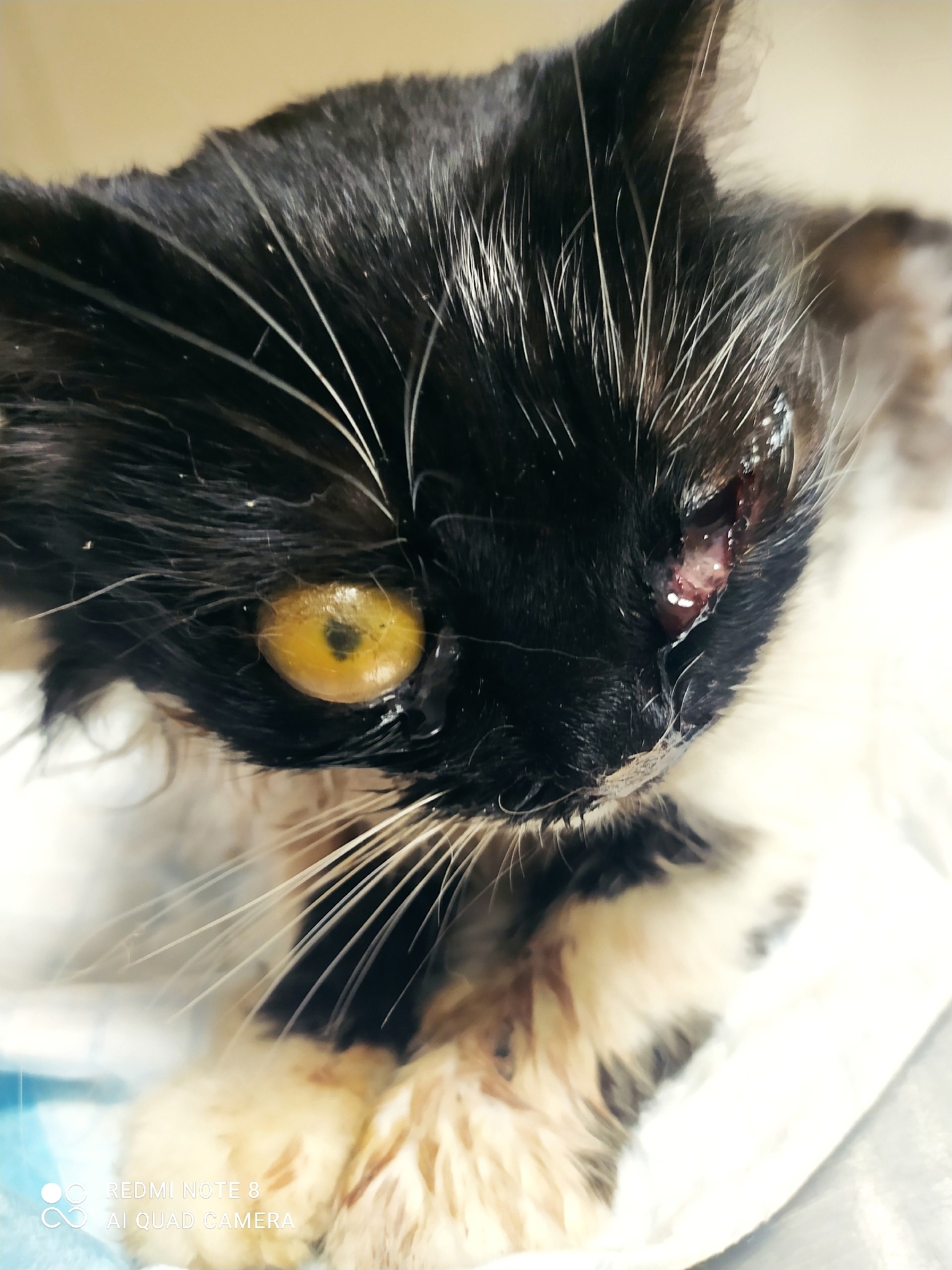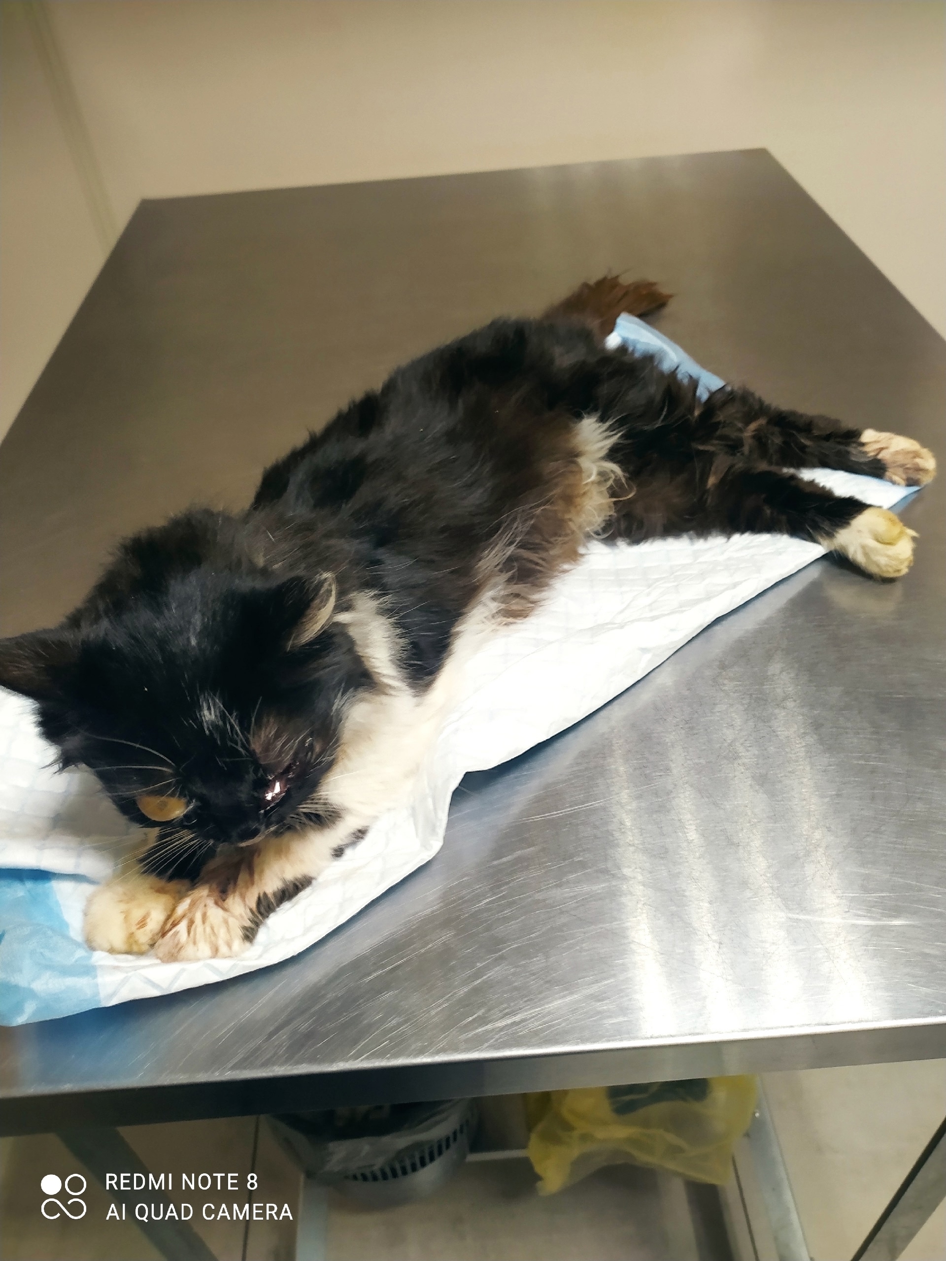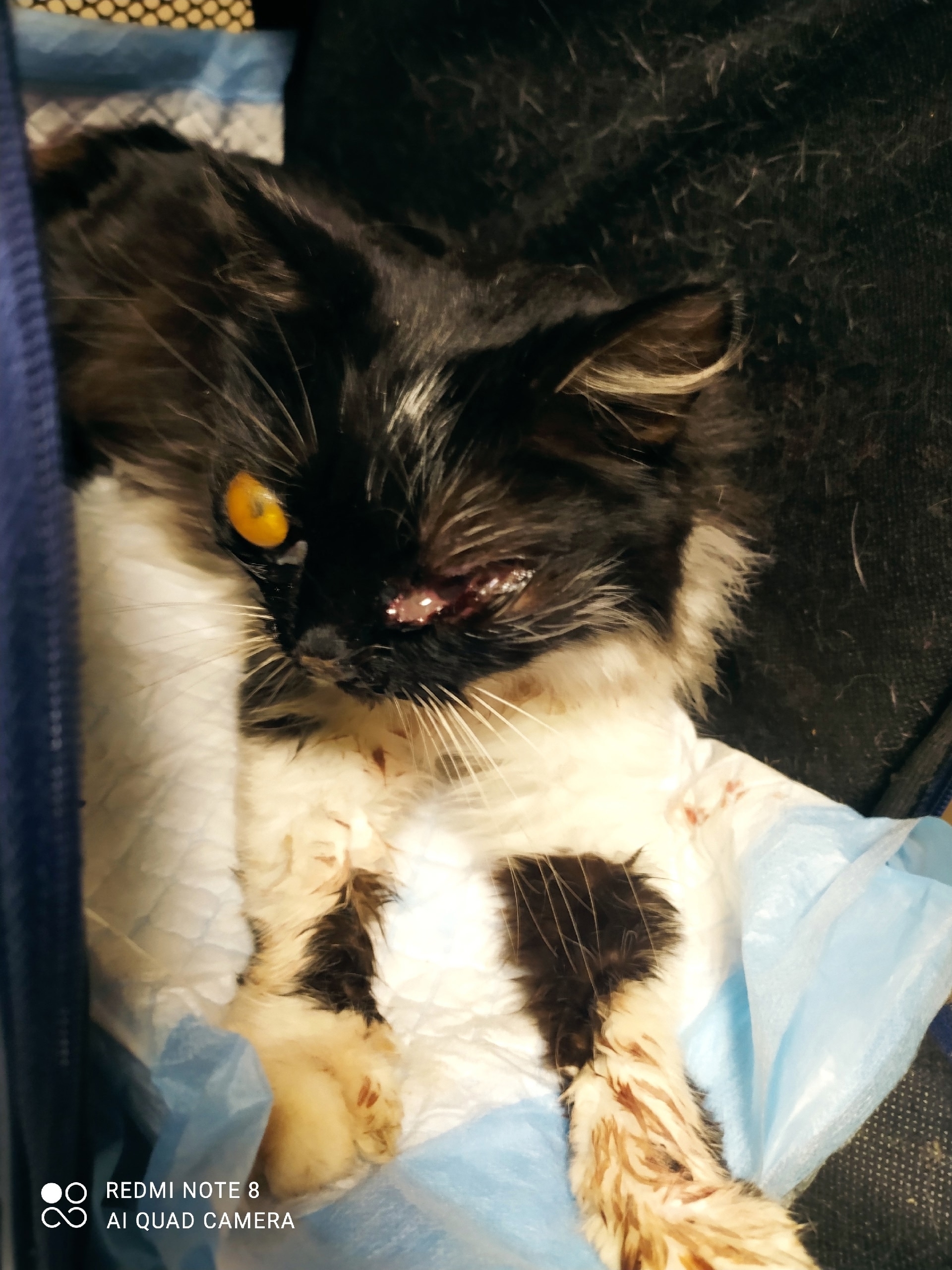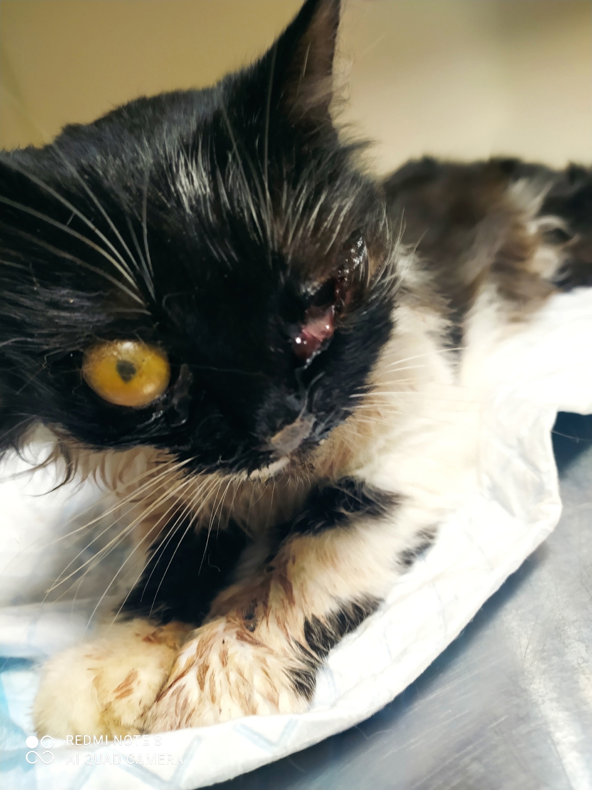 🆘 Найдена кошка, Толмачево, в клинике сказали скорее всего сбила машина. Один глаз точно на удаление, второй под вопросом пока. Сломана челюсть, после стабилизации состояния будет проведена операция, может понадобится не одна