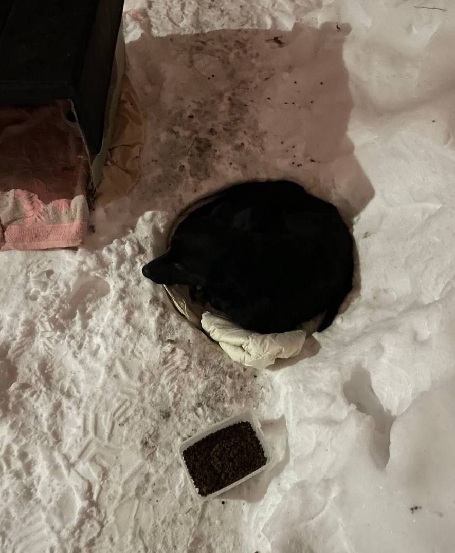 Он выкопал себе ямку в снегу, где лежит и не уходит… Это молодой, добрый пёс, просто ему не повезло с семьёй 💔