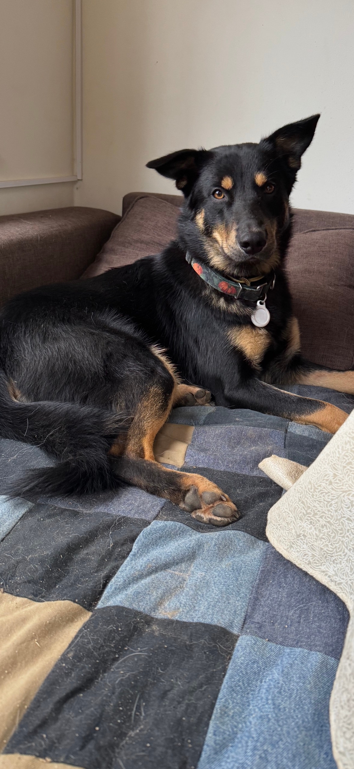 Среднего размера (чуть выше колена), окрас черный с рыжими подпалом.