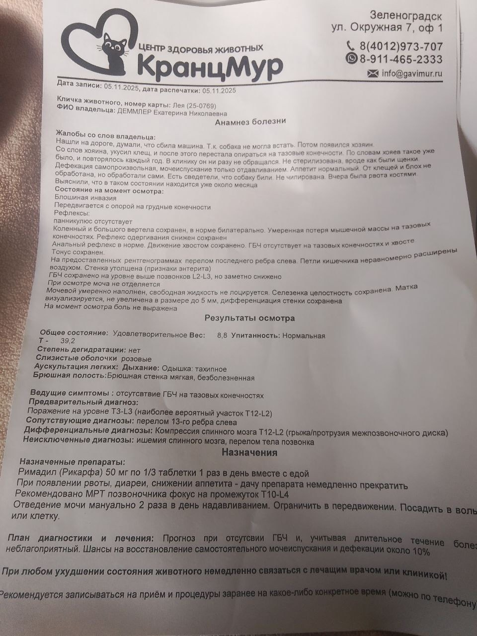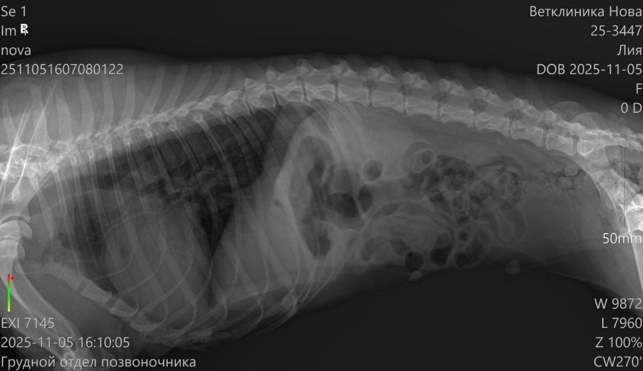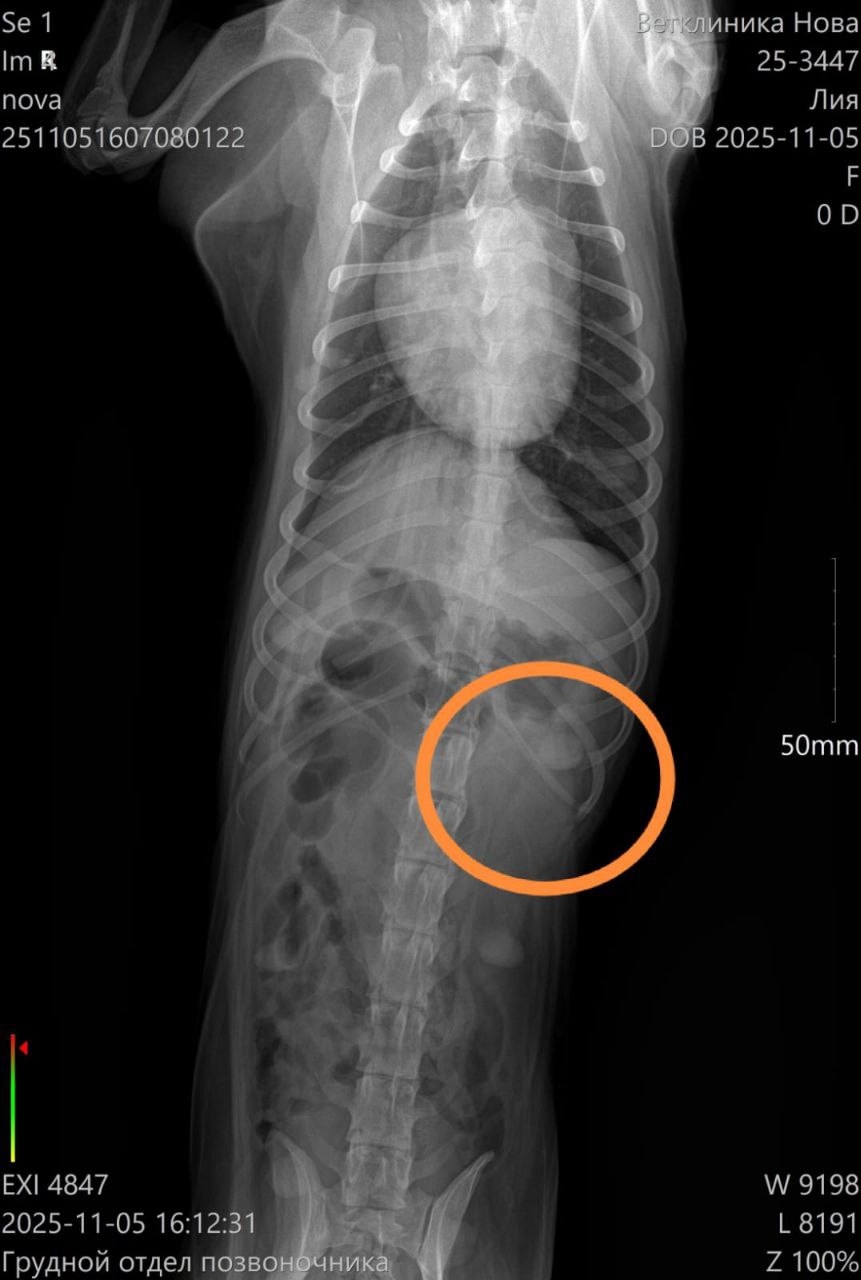 Девчонка не встает на задние лапы,чувствительности нет. Сделали рентген,по снимку у Леи сломано ребро(травма старая,органы не задевает,поэтому трогать ее не нужно.)