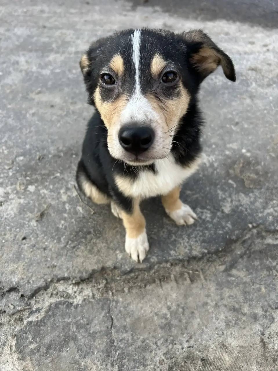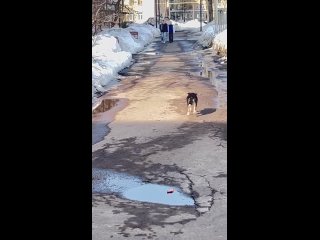 Очередная жертва издевательств. Похоже пинали , походка как будто задние ноги болят и лоб побрит у щенка за ушами.