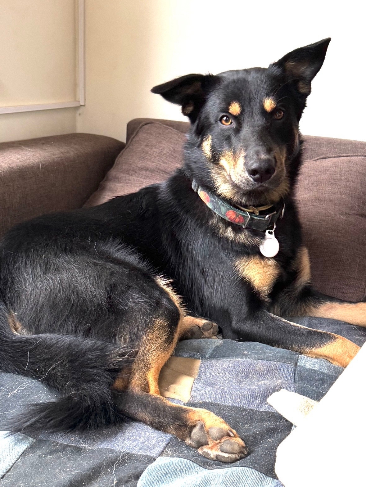 Чёрный с рыжим, чуть выше колена.