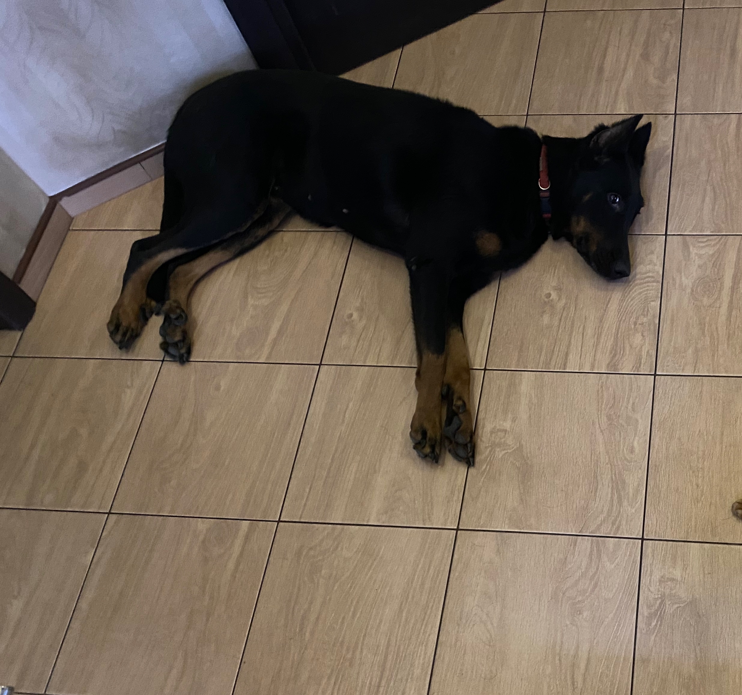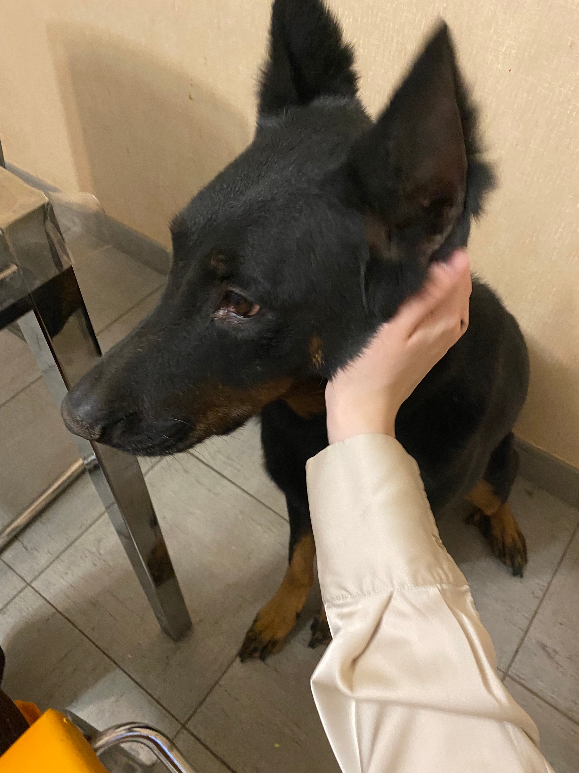 чёрная французская овчарка по кличке Грейс, очень пугливая, боится громких звуков, добрая. ошейник красного цвета
